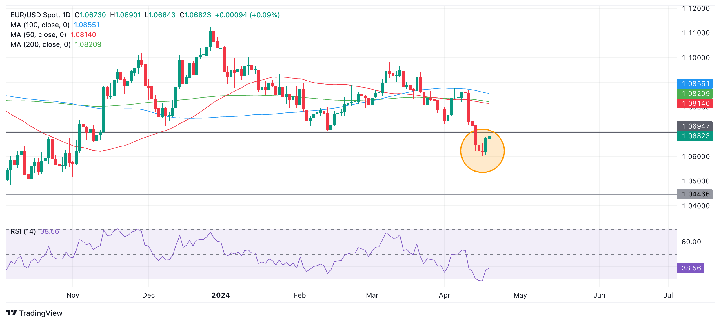 欧元/美元周四交投于 1.0680 附近,当天小幅走高,在触及 4 月低点 1.0601 后在周中开始掉头。