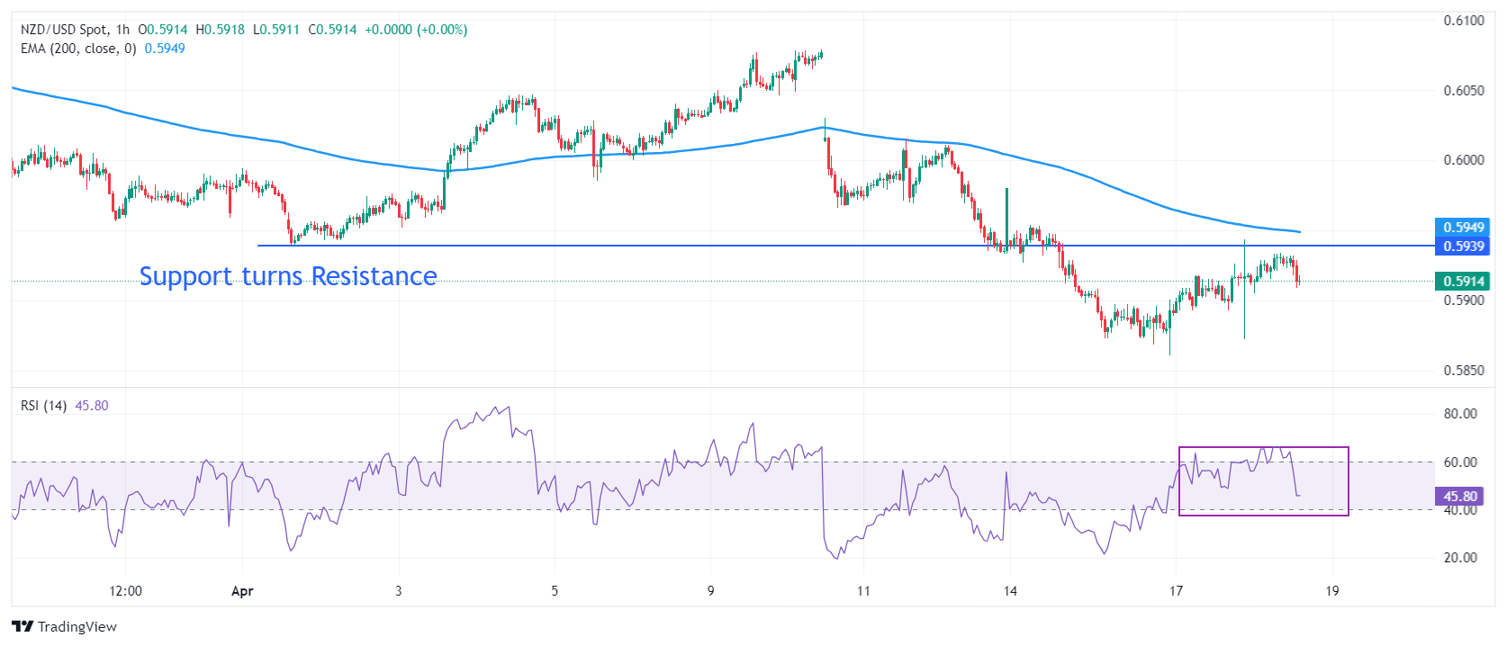 新西兰元/美元在 4 月 1 日低点 0.5940 附近面临抛售压力,该压力在每小时时间框架内成为新西兰多头的阻力。由于该资产交易价格低于 200 小时指数移动平均线 (EMA)(交易价格约为 0.5950),因此近期前景仍然看跌。