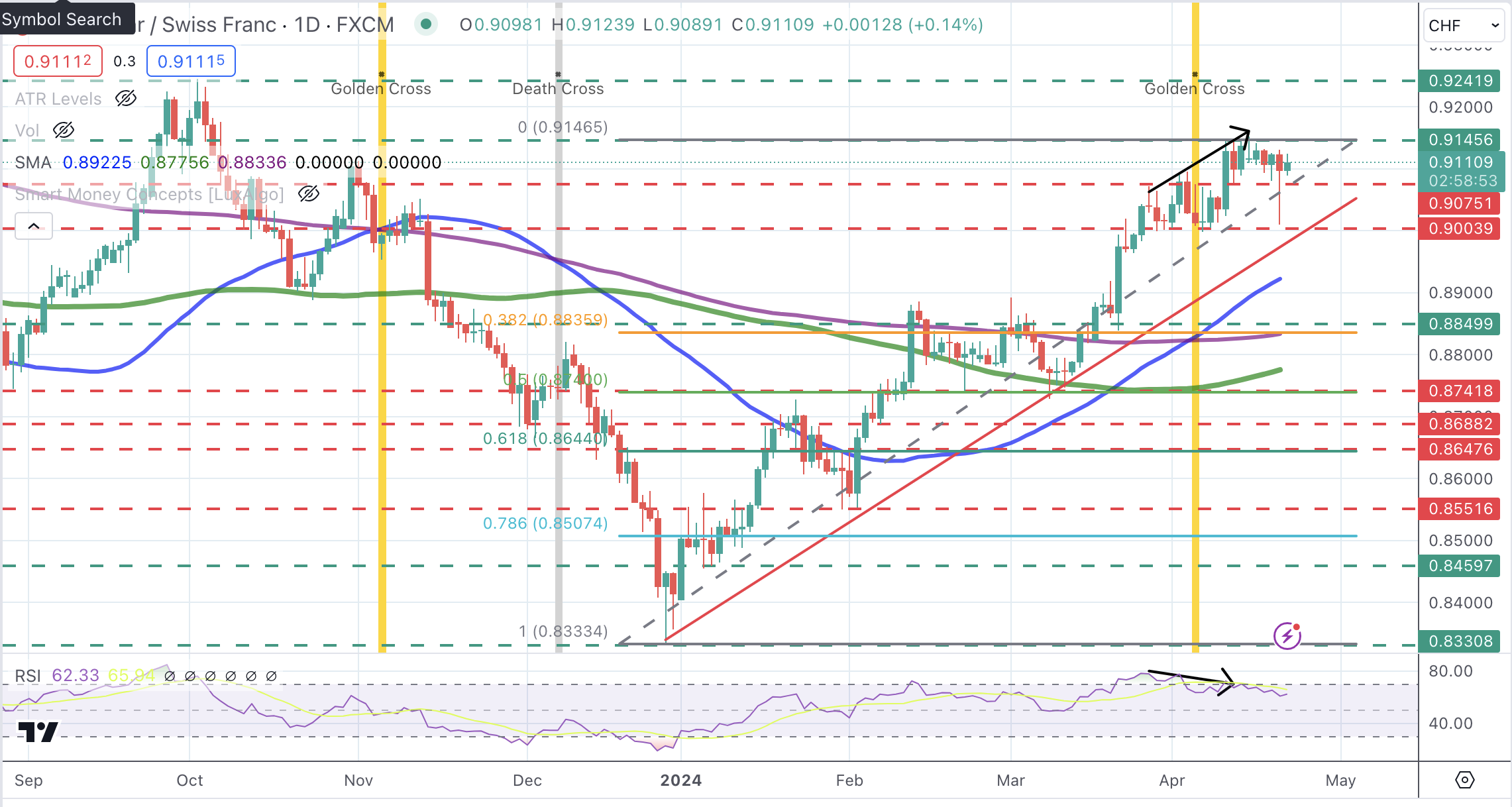 技术指标显示看涨趋势仍然活跃,除了 4 小时 RSI 出现一些看跌背离外,没有明显的趋势转变迹象。直接支撑位 0.9075 正在关闭通往关键 0.8980 - 0.9000 区域的路径,该区域是 3 月底低点和趋势线支撑位的交汇处。