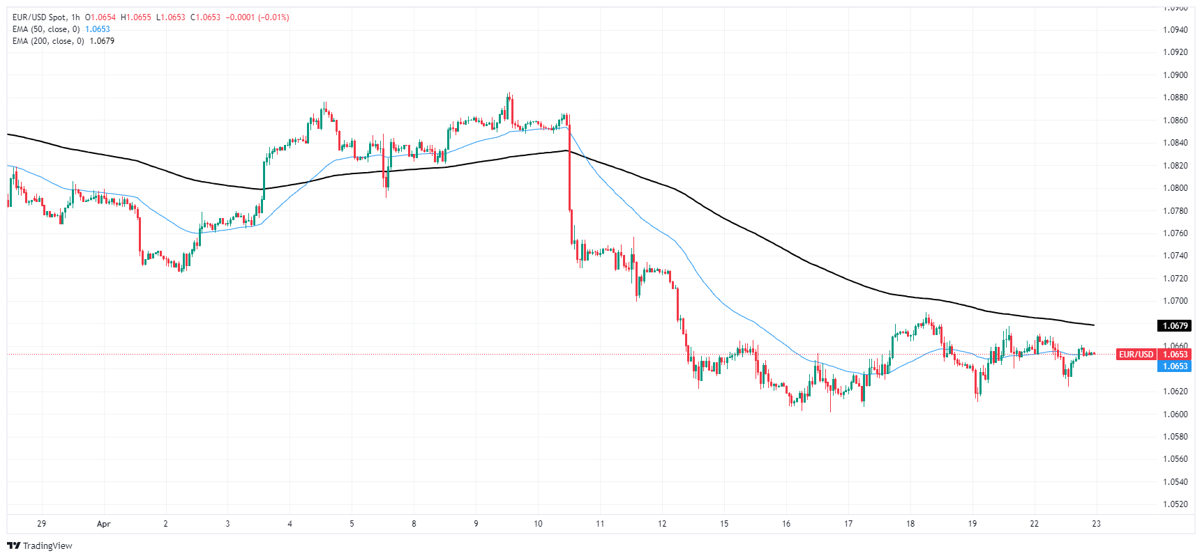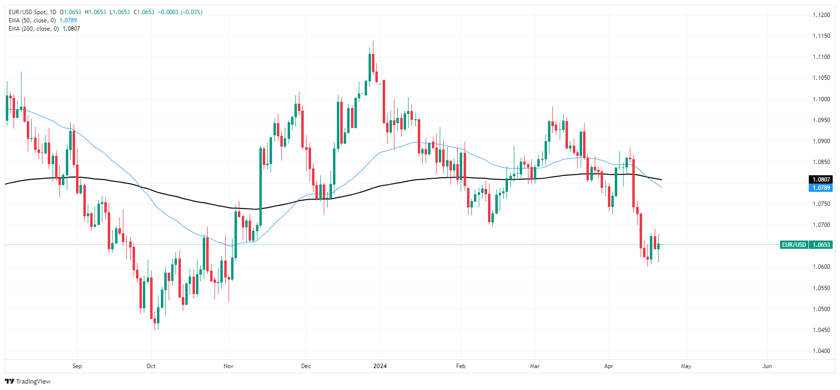 欧元/美元汇率近期从 1.0880 水平下跌后,目前稳定在 1.0650 附近,其中 4 月份从峰值到谷底下滑了 2.62%。从略高于 1.0600 关口的近期低点回升有限,导致该货币对在 200 小时指数移动平均线 (EMA) 的低端苦苦挣扎,因为价格走势正在寻找底部。