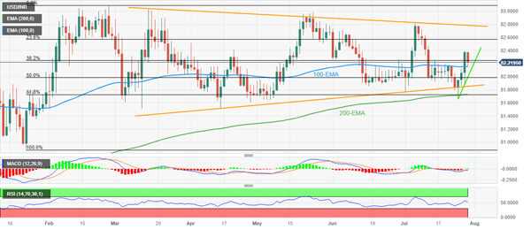 如果印度卢比跌破 82.00,连接 3 月份以来水平的对称三角形底线(目前位于 82.80 至 81.85 之间)将成为人们关注的焦点。