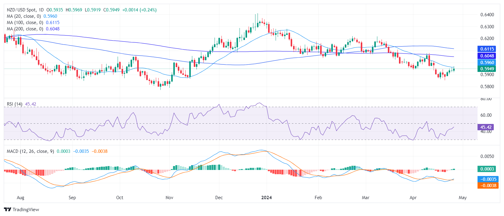 在日线图上,新西兰元/美元货币对的相对强弱指数(RSI)继续处于负趋势区域内。然而,随着 RSI 值暗示上升势头,存在一些市场可能调整的信号。同时,移动平均线收敛分歧(MACD)显示绿色柱不断上升,表明买家逐渐逼近卖家,为市场带来积极动力。