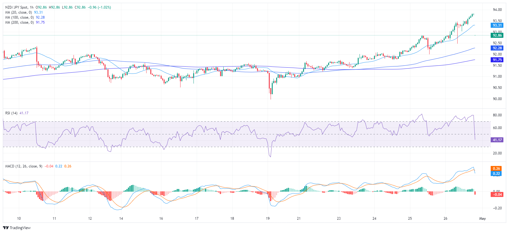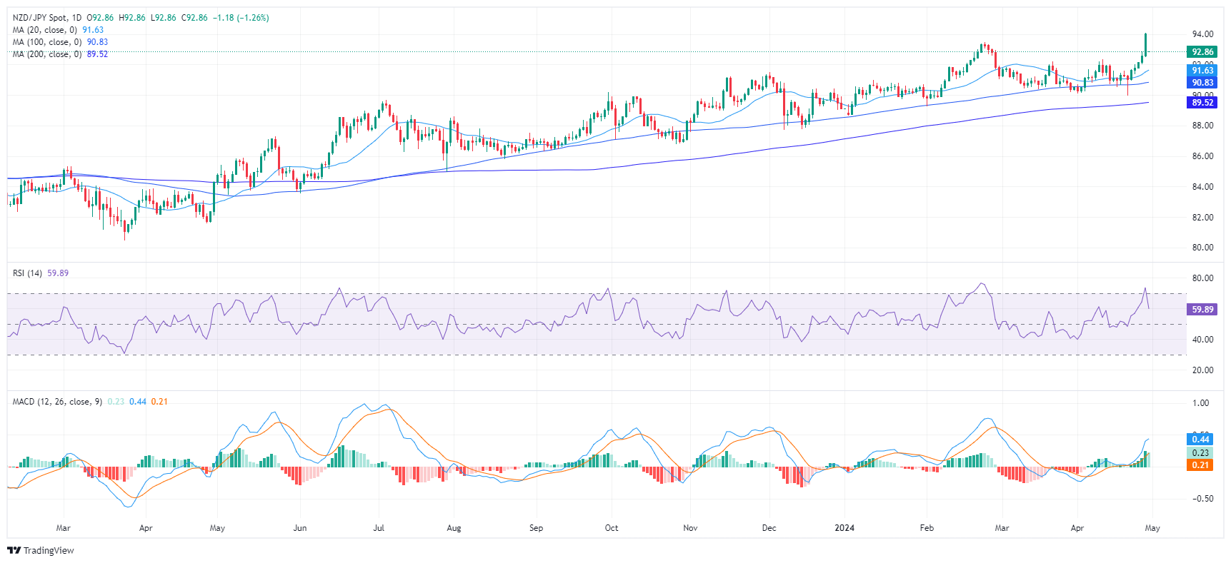 纽元/日元货币对周二下跌 0.45%,交易于 92.99。尽管存在一些看跌情绪,但纽元/日元在其主要简单移动平均线(SMA)之上仍保持长期看涨趋势。短期动力可能会发生转变,因为投资者在周一将货币对推升至 2015 年以来的高位后开始获利了结。