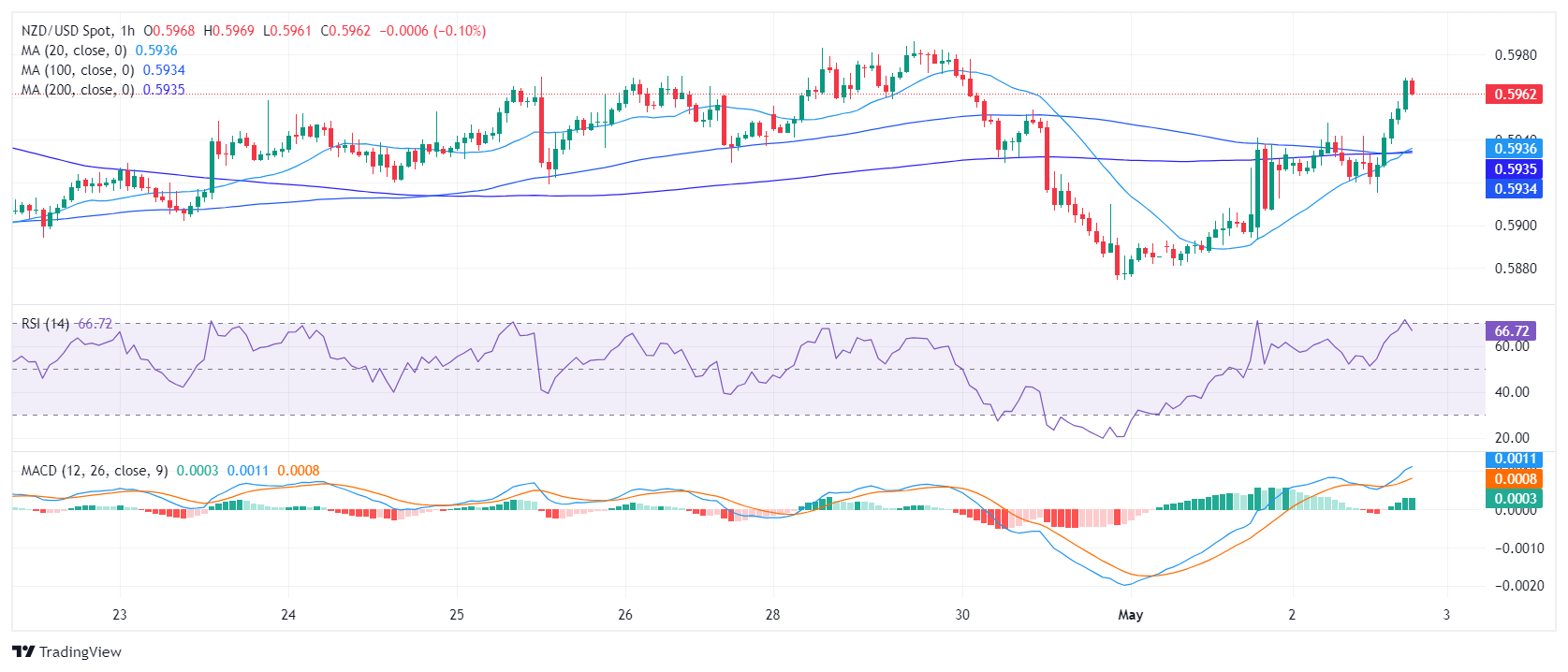 新西兰元/美元周四上涨至 0.5961,上涨 0.56%,并跃升至关键的短期 20 日简单移动平均线 (SMA) 之上,该平均线现在表明存在潜在的看涨倾向。然而,更广泛的趋势仍然看跌。随着每小时购买力的急剧增加,买家可能会在亚洲时段之前获利了结。