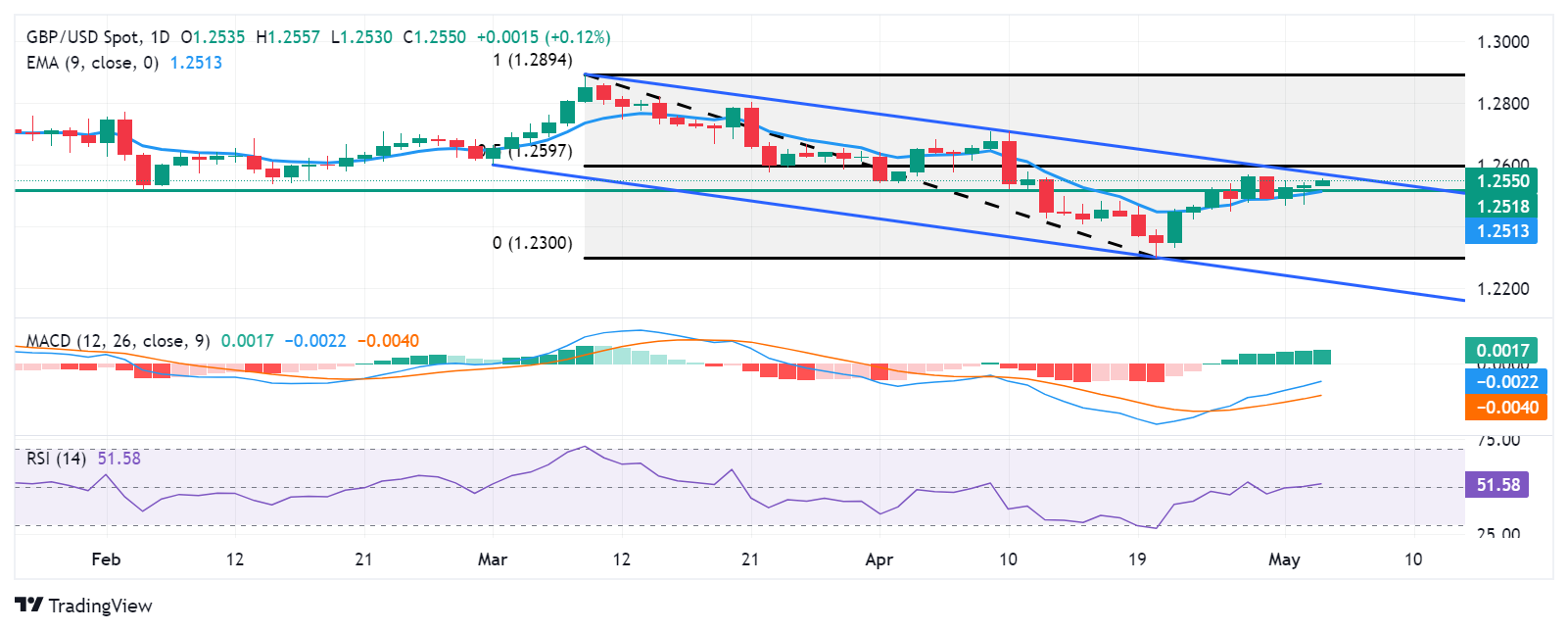 周五,英镑/美元连续第三个交易日延续涨势,亚洲时段交投于 1.2550 附近。日线图上,该货币对在下降通道内盘整,14 天相对强弱指数 (RSI) 移至 50 水平上方。表明看跌偏见减弱。