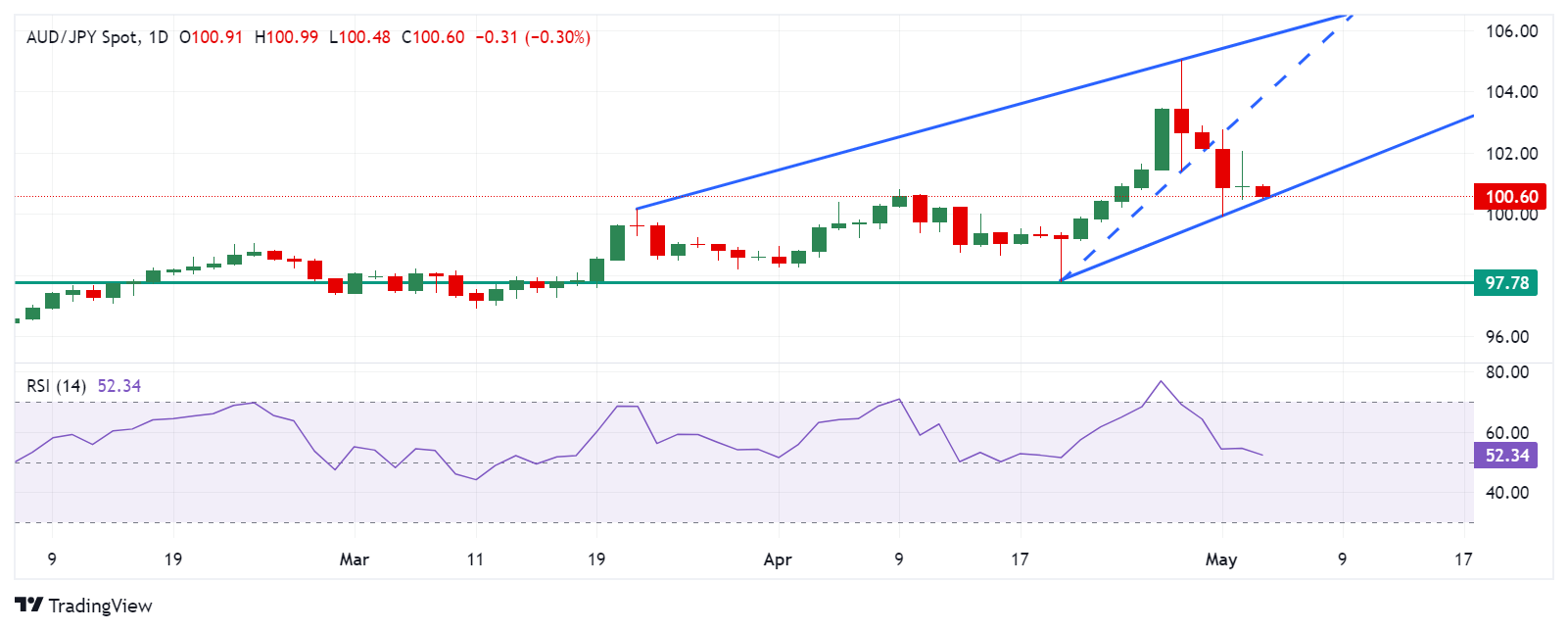 跌破上升通道的下限可能会导致澳元/日元交叉进入 100.00 心理水平附近的区域。进一步下跌可能会加剧看跌偏见,并对货币交叉盘施加压力,使其触及 4 月份低点 97.78。