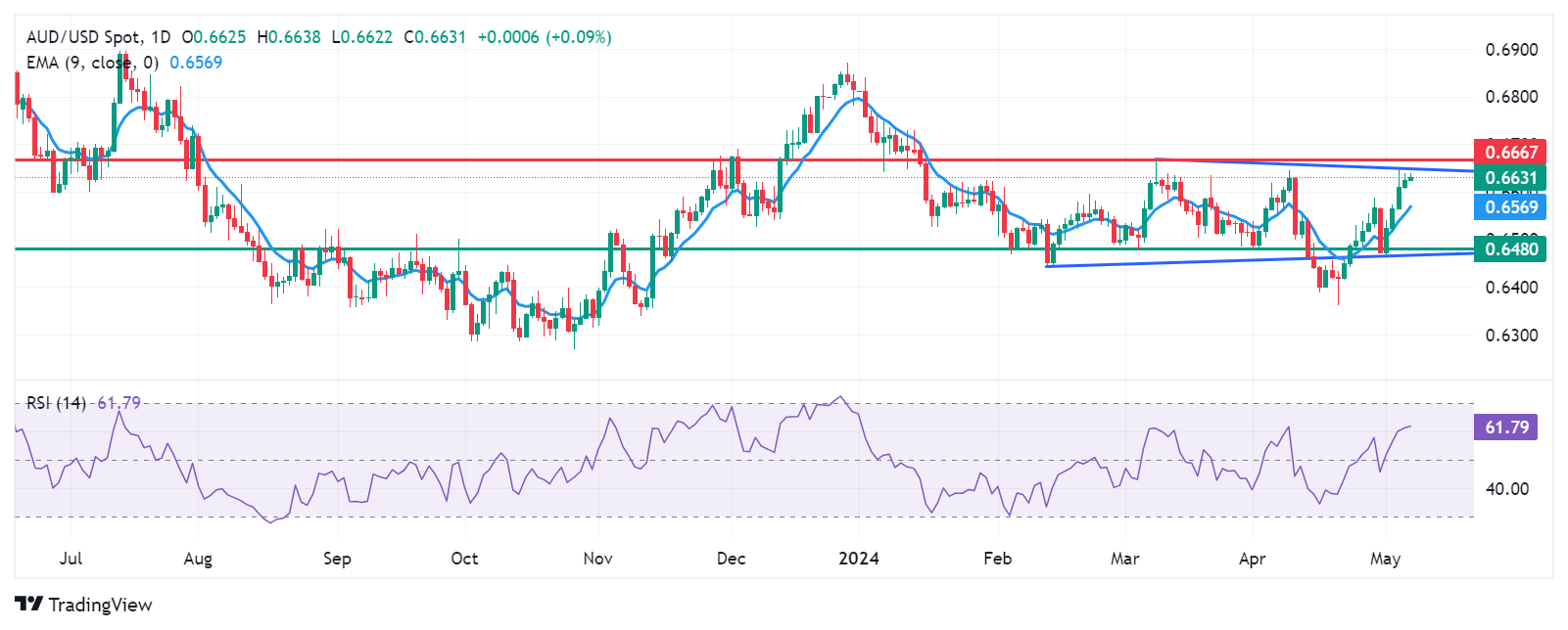 周二澳元兑美元交投于 0.6610 附近。该货币对在对称三角形形态内盘整,14 天相对强弱指数 (RSI) 高于 50 水平,表明看涨倾向。