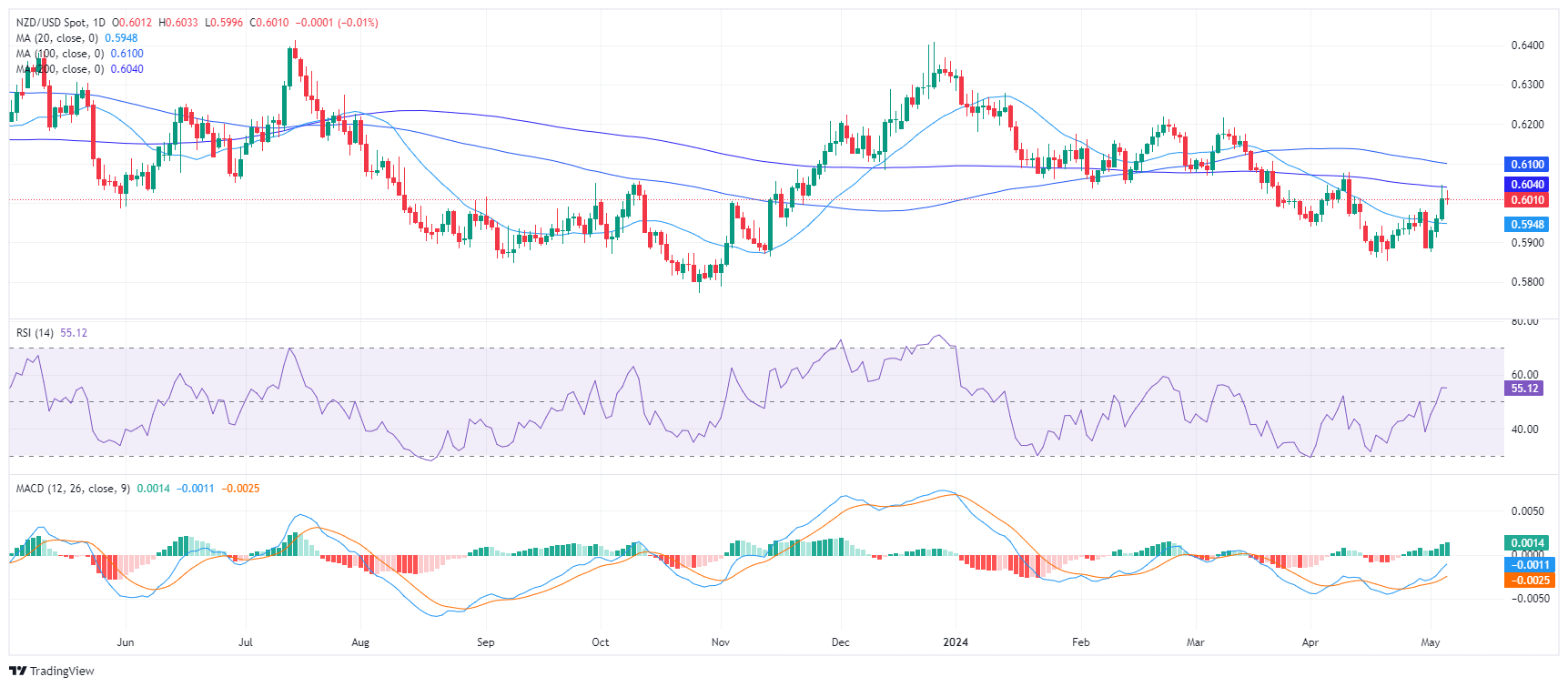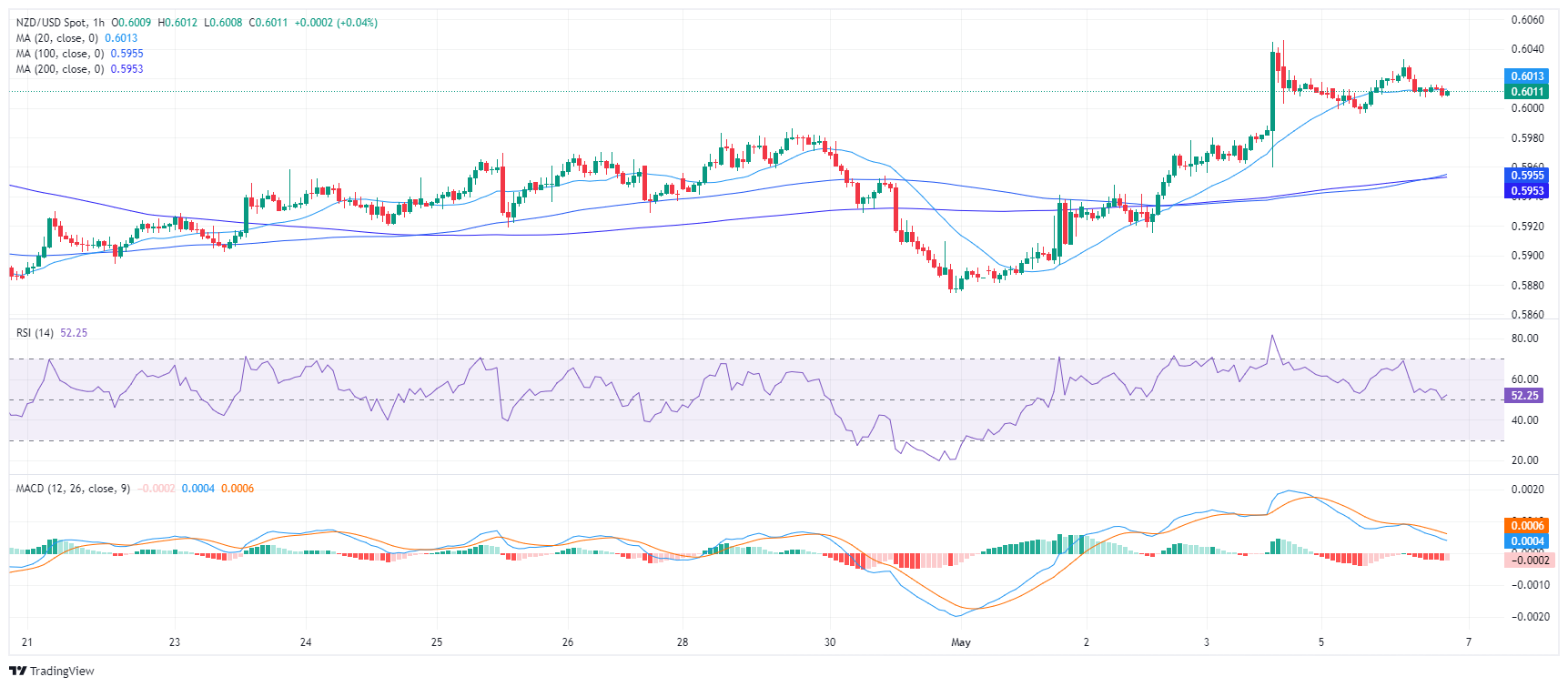 新西兰元/美元汇率小幅下跌,周一交易中跌向 0.6000 水平。市场格局似乎以看涨波动为主,表明买家控制力增强。尽管如此,看跌走势的可能性仍然存在,因为关键的简单移动平均线(SMA)和不断变化的投资者情绪表明多头需要进一步验证。