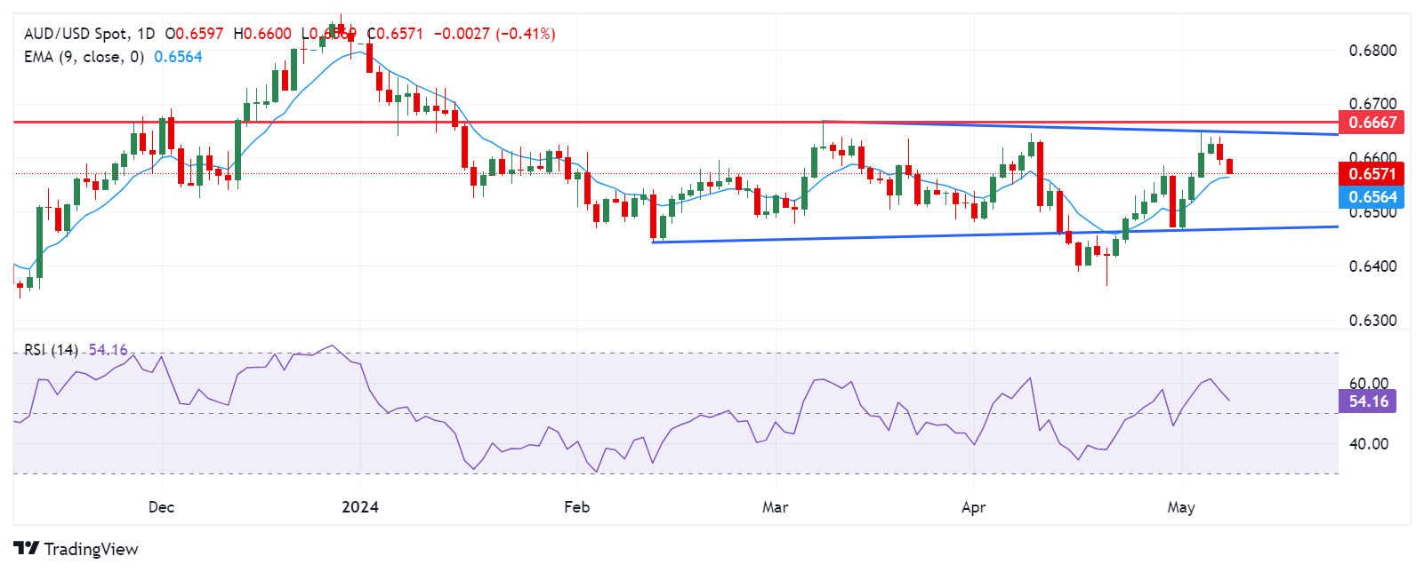 周三澳元兑美元交投于 0.6570 附近。该货币对在对称三角形形态内盘整,14 天相对强弱指数 (RSI) 高于 50 水平,表明看涨倾向。