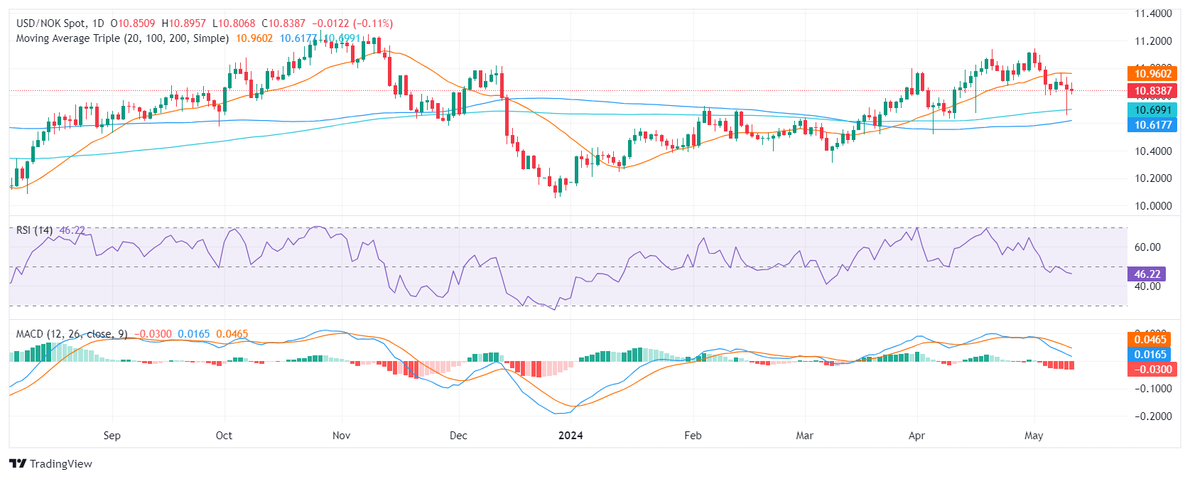 美元/挪威克朗货币对的每日相对强弱指数 (RSI) 基本上仍处于负值区域。今天的读数为 46.66,这表明短期前景有些悲观。由于其波动性,RSI 最初处于接近超买的高位,随后又下跌,表明存在潜在的看跌压力。然而,持续存在于负值区域也警告了持续下跌趋势的可能性。