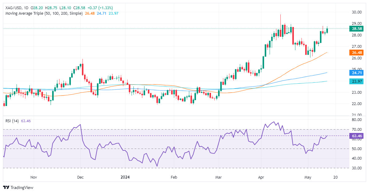 过去三天,白银自 5 月 2 日以来呈指数级上涨,一直在 28.00 美元至 28.80 美元区间内波动,这使得灰色金属的价格从 26.02 美元左右升至目前的现货价格。