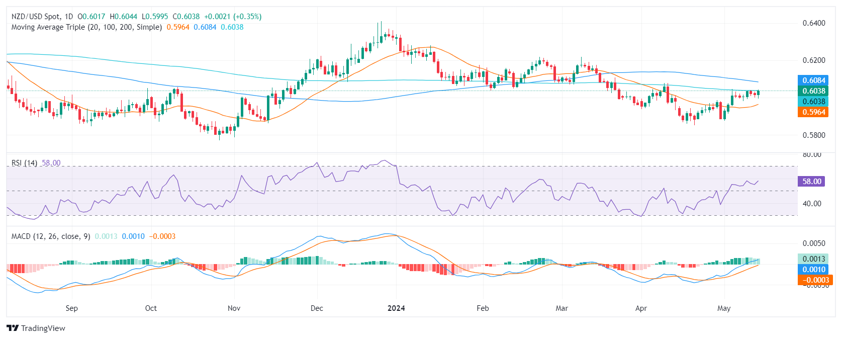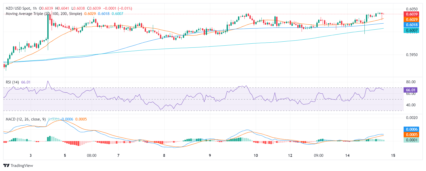 日线图上新西兰元/美元货币对的每日相对强度指数(RSI)反映了积极的趋势。最新读数位于 50 水平之上,该货币对正倾向于积极区域。移动平均线趋同背离 (MACD) 呈现出平坦的绿色条形,暗示积极势头的延续,尽管步伐停滞。