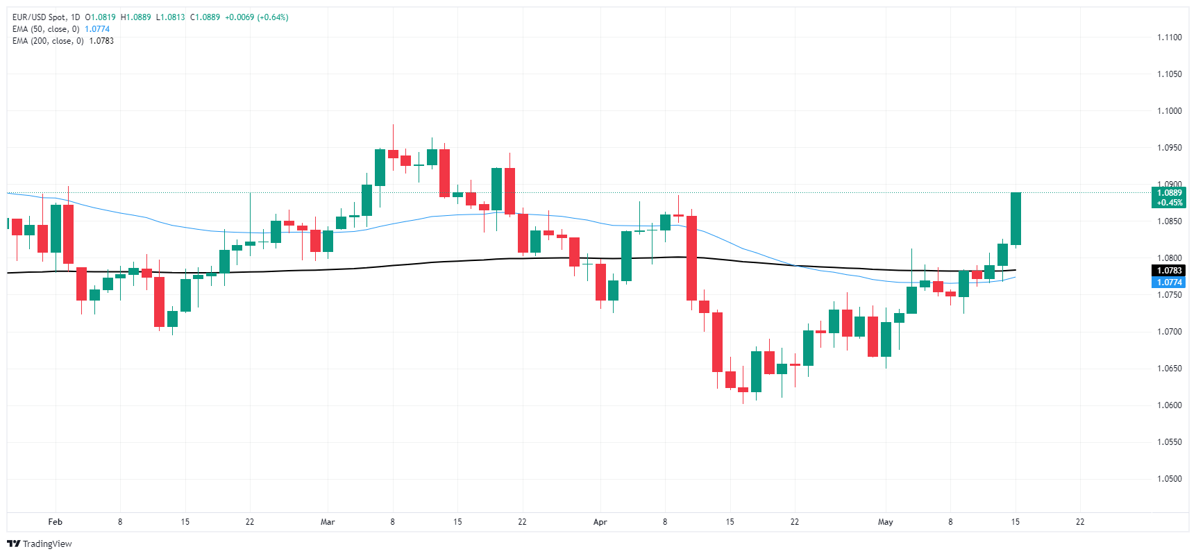 欧元/美元在 1.0900 关口看涨,该货币对延续了从 1.0730 开始的 200 小时指数移动平均线 (EMA) 的看涨反弹。200小时均线正在升至1.0780上方,但盘中买盘已将欧元/美元拖至远高于技术指标的水平,该货币对较4月波动低点1.0600附近上涨超过2.7%。