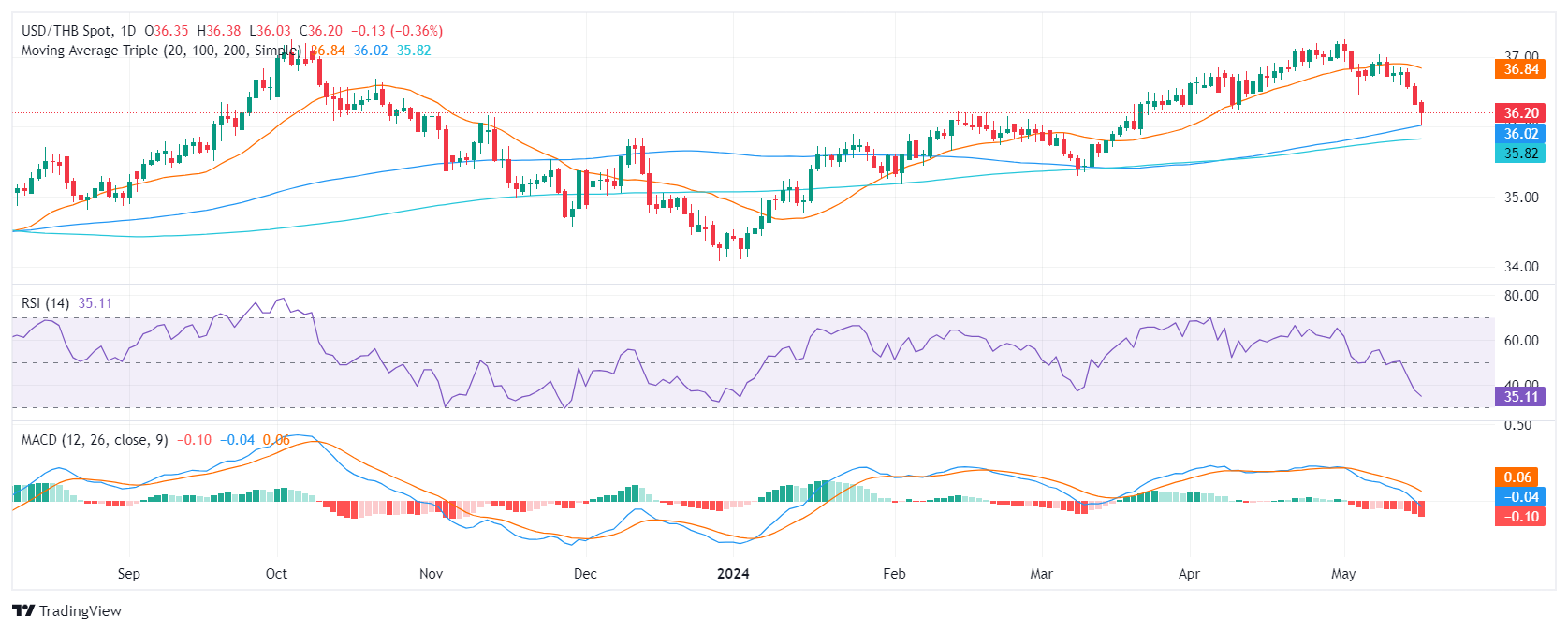 美元/泰铢货币对相对于简单移动平均线 (SMA) 的位置显示其位于 20 日均线下方,但高于 100 日和 200 日均线。这表明,虽然短期前景悲观,但只要买家捍卫这些水平,中长期前景仍然乐观。