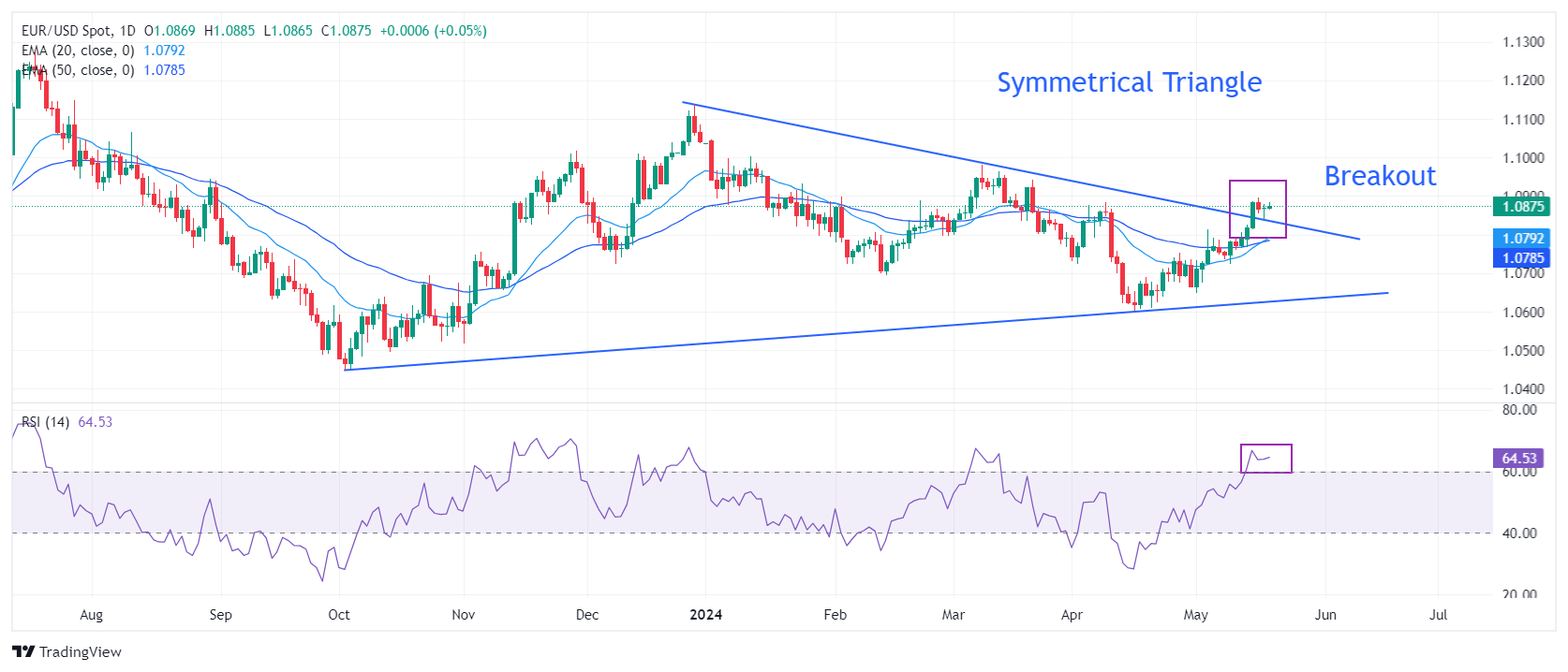 欧元/美元突破每日时间框架上的对称三角形图表模式。主要货币对稳定在突破区域上方表明该资产相当看涨。此外,20 天和 50 天指数移动平均线 (EMA) 在 1.0780 附近的看涨交叉改善了该货币对的近期前景。