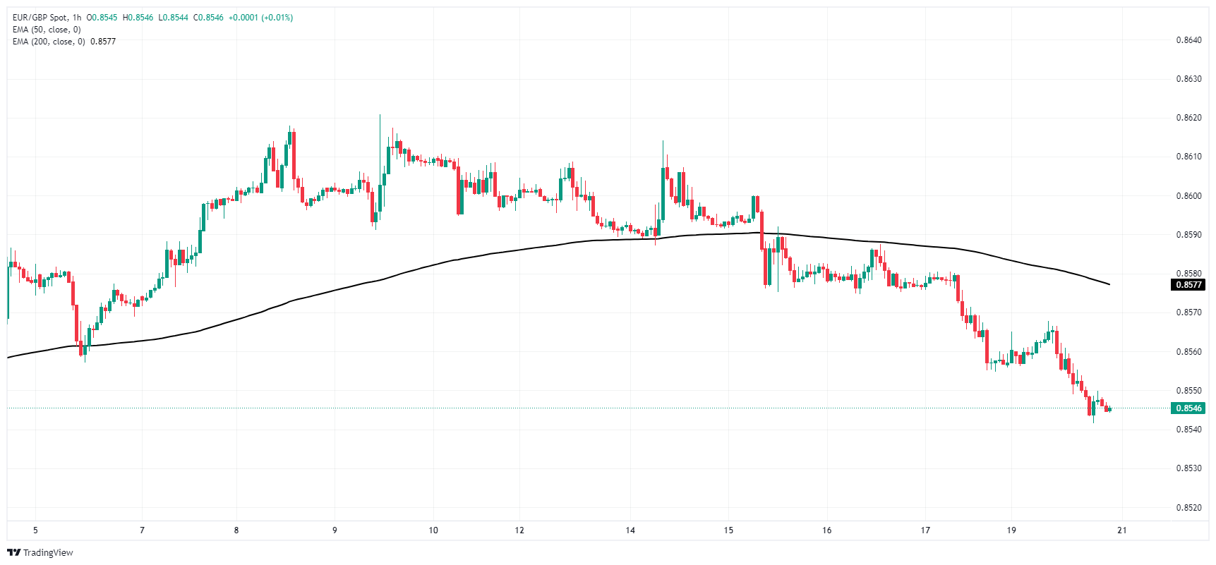 欧元/英镑在跌破 0.8590 附近的关键技术指标后,正在加速跌破 200 小时指数移动平均线 (EMA)。200小时均线转为看跌至0.8577,且该货币对正在进一步进入空头区域,跌破0.8550。