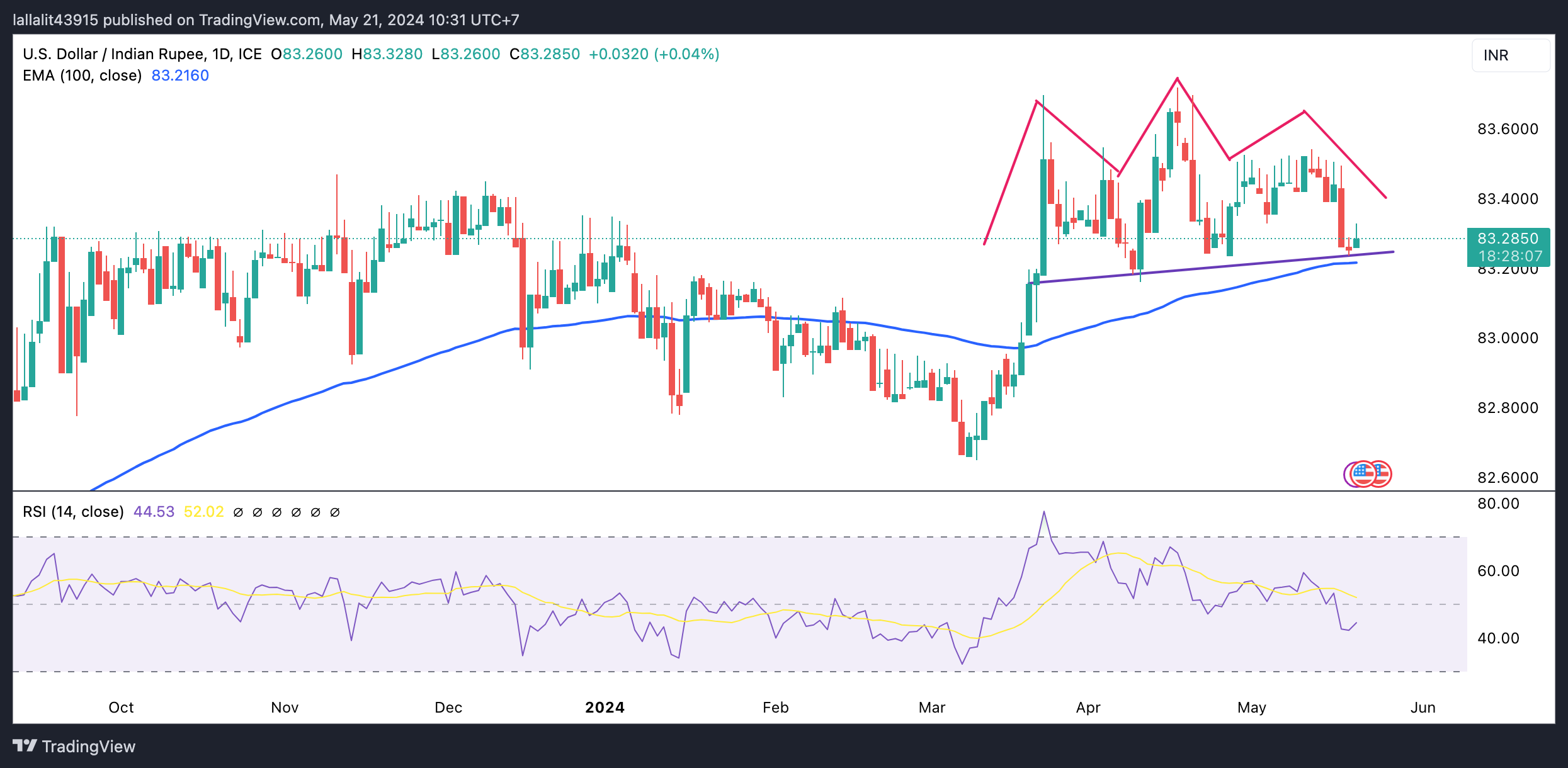 美元/印度卢比的第一个上行障碍将出现在右肩 83.54(5 月 13 日的高点)附近。突破这一水平将最终使头肩形态失效。下一个障碍出现在 4 月 17 日的高点 83.72 附近。