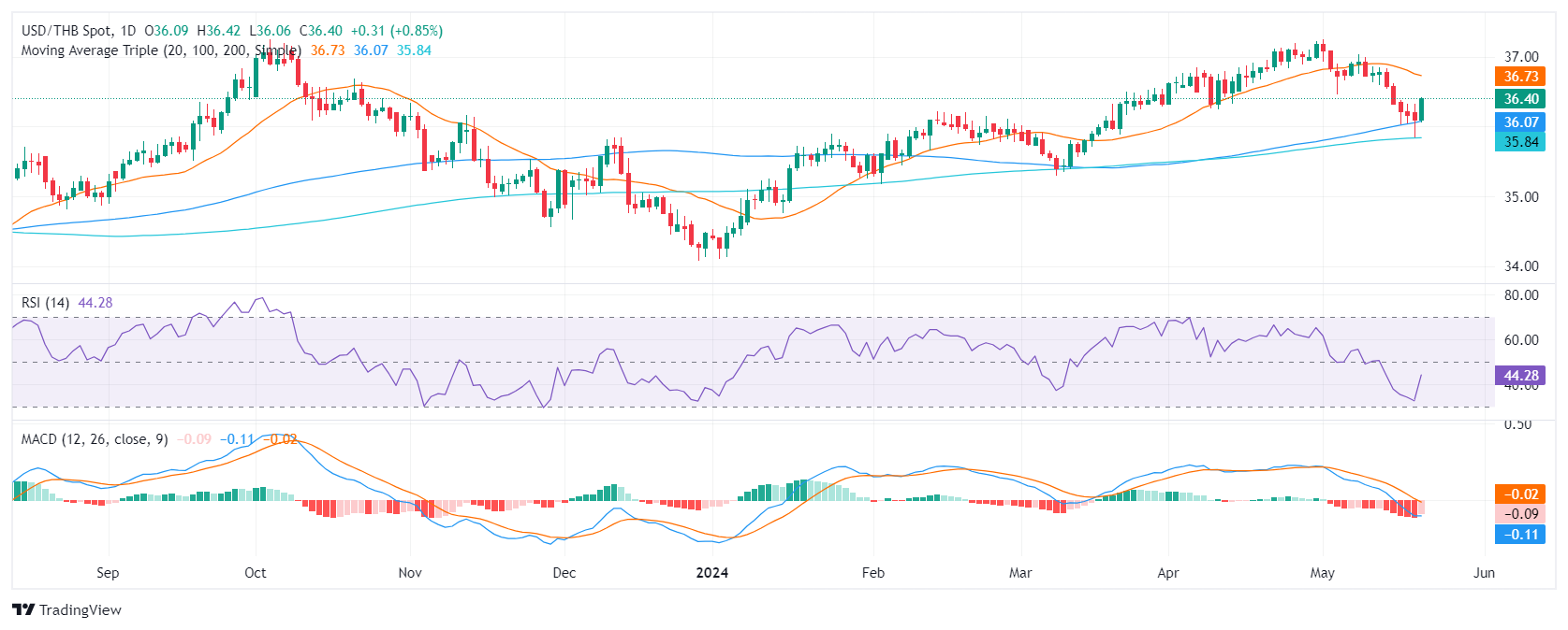 美元/泰铢周二获得显着牵引力,上涨 0.80%,因为空头未能攻克 36.05 的 100 日简单移动平均线 (SMA),因此筋疲力尽。尽管4月份美国消费者价格指数(CPI)数据反映通胀数据强于预期,但由于美联储( Fed)继续要求对降息保持耐心,美元仍坚守阵地。