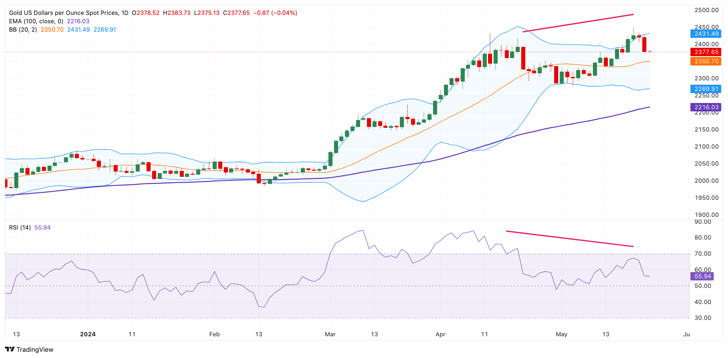 贵金属的关键阻力位将出现在布林带上界和历史高点 2,450 美元附近。突破该水平将暴露 2,500 美元的心理关口。