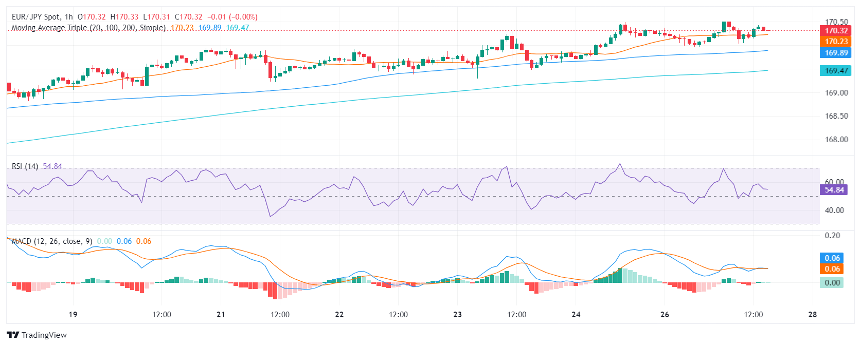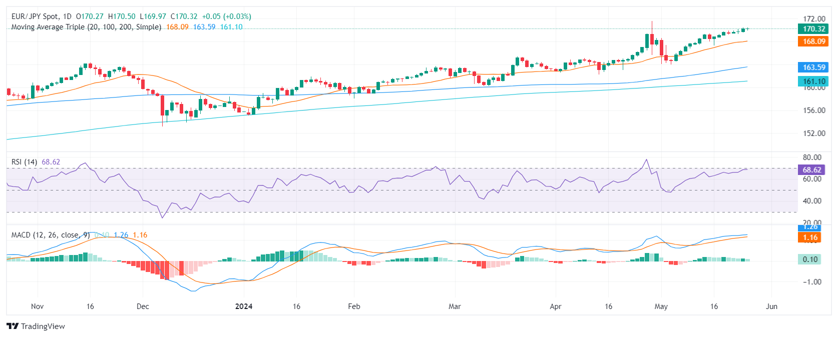 在每日分析中,欧元/日元对的相对强度指数(RSI)一直呈稳定正趋势。该公司指出,由于最近的指数已接近超额买入的范围,买家持有强劲的地位。同时,移动平均收敛发散(MACD)直方图加强了这一立场,表明平坦的绿条象征着稳定但平坦的正势头。