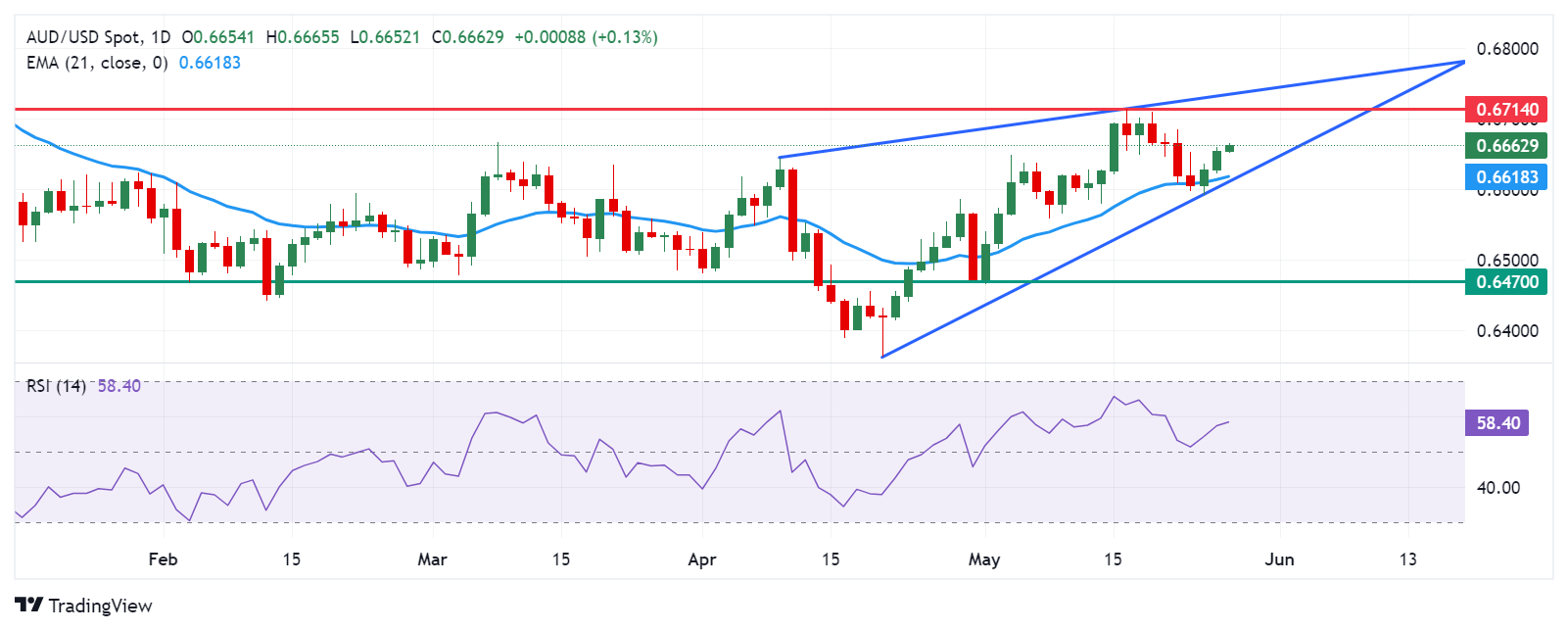 澳元周二的交易额约为0.6660。对每日图表的分析表明,澳元/美元对的看涨偏差,因为它位于上升的楔形内。14天相对强度指数(RSI)略高于50水平,进一步证实了这种看涨偏差。
