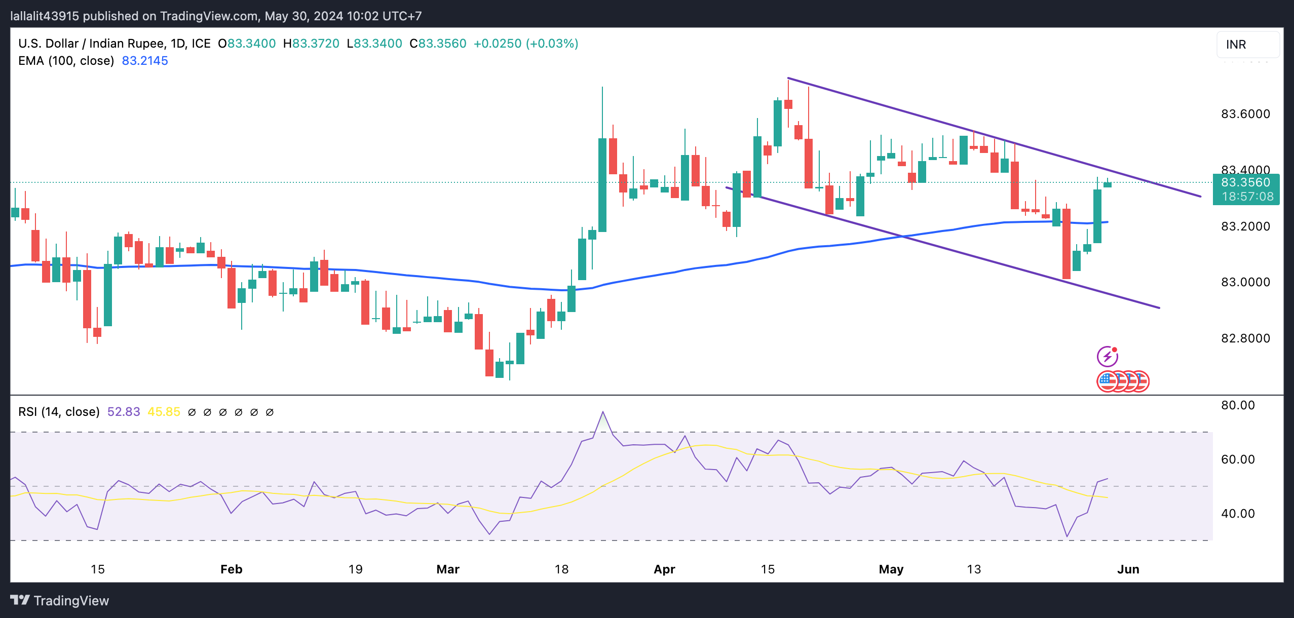 自4月中旬以来,美元/INR已形成一个下降趋势通道。航道的上部边界为83.40,将是一对的第一个上界屏障。如果在这一水平上出现决定性的突破,则5月13日的高点将在83.54点出现,而4月17日的高点将在83.72点出现,最后是84.00点。