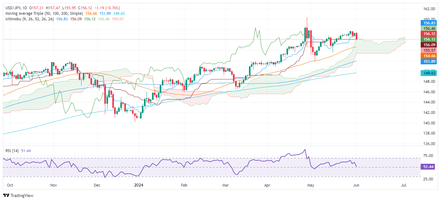 从每日图表的角度来看,美元/日元未能突破157.50阻力水平,跌破157.00指数以下,加剧了约155.95的伊米诺库云(库莫)顶部以下的下跌,为进一步的损失打开了大门。