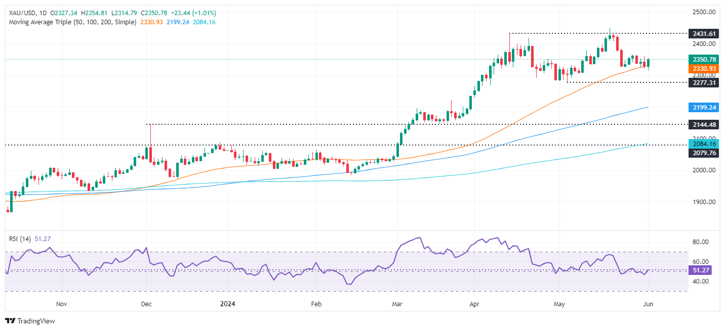 黄金价格上涨趋势在50天简单移动平均价格(SMA)反弹至2331美元后保持不变。由于相对强劲指数(RSI)保持在50中线以上,市场势头转向了有利于买家,为黄金的进一步上涨打开了大门。