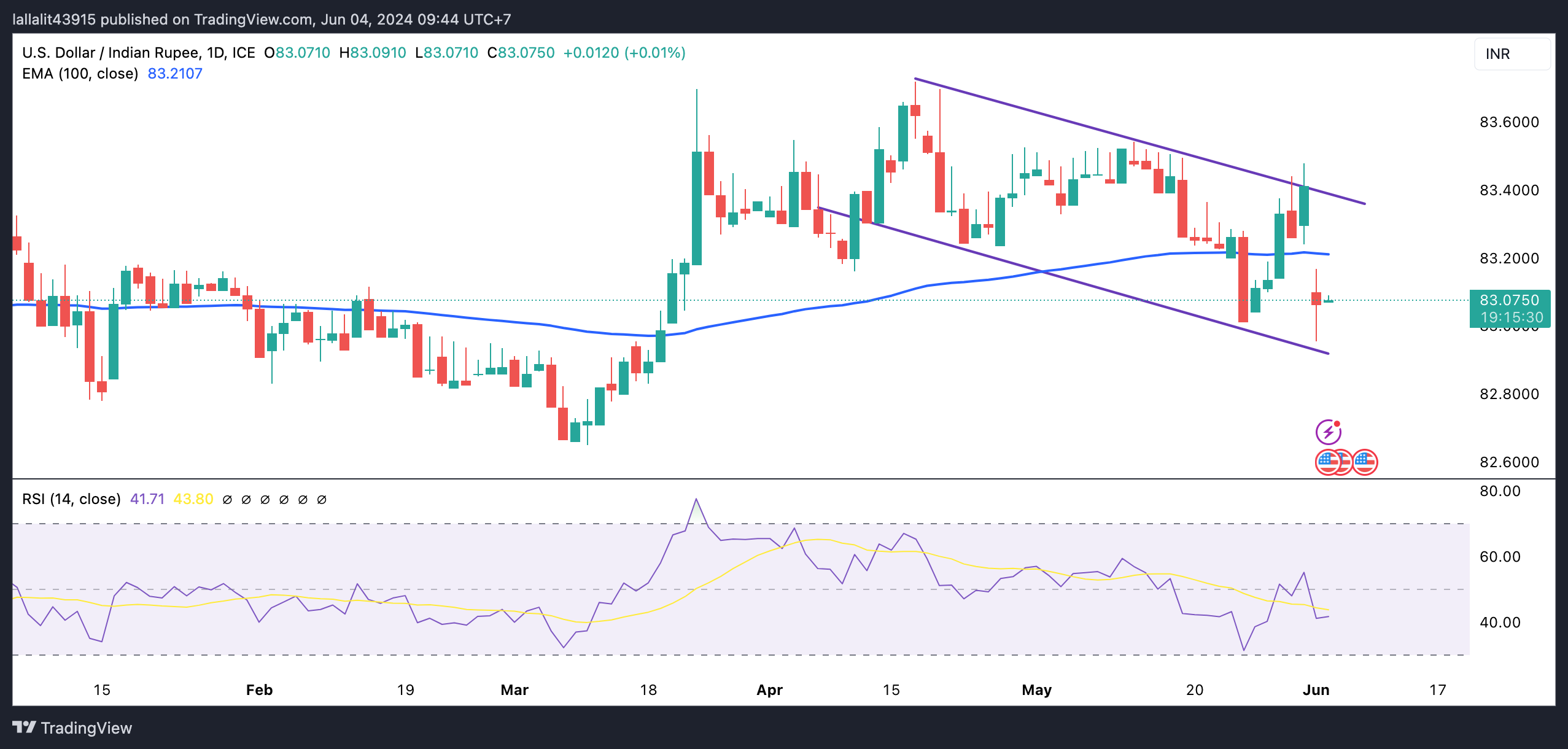 印度卢比白天交易较为温和。美元/INR对看跌日时序,因为这对对超过了关键的100日指数移动平均线(EMA),14日相对强度指数(RSI)仍保持在50线中线以下,表明进一步的下跌看起来是有利的。
