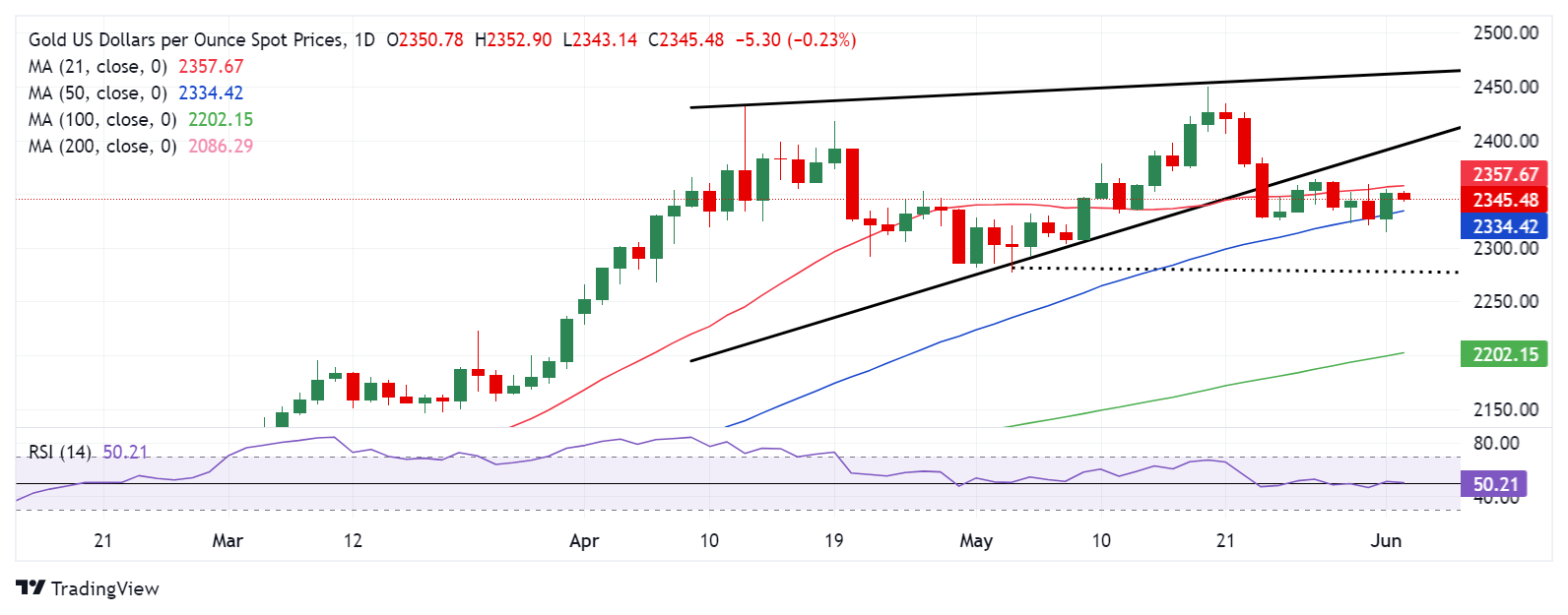 如每日图表所示,黄金价格继续介于21天简单移动平均价格(SMA)和50天SMA之间,分别为2357美元和2334美元。