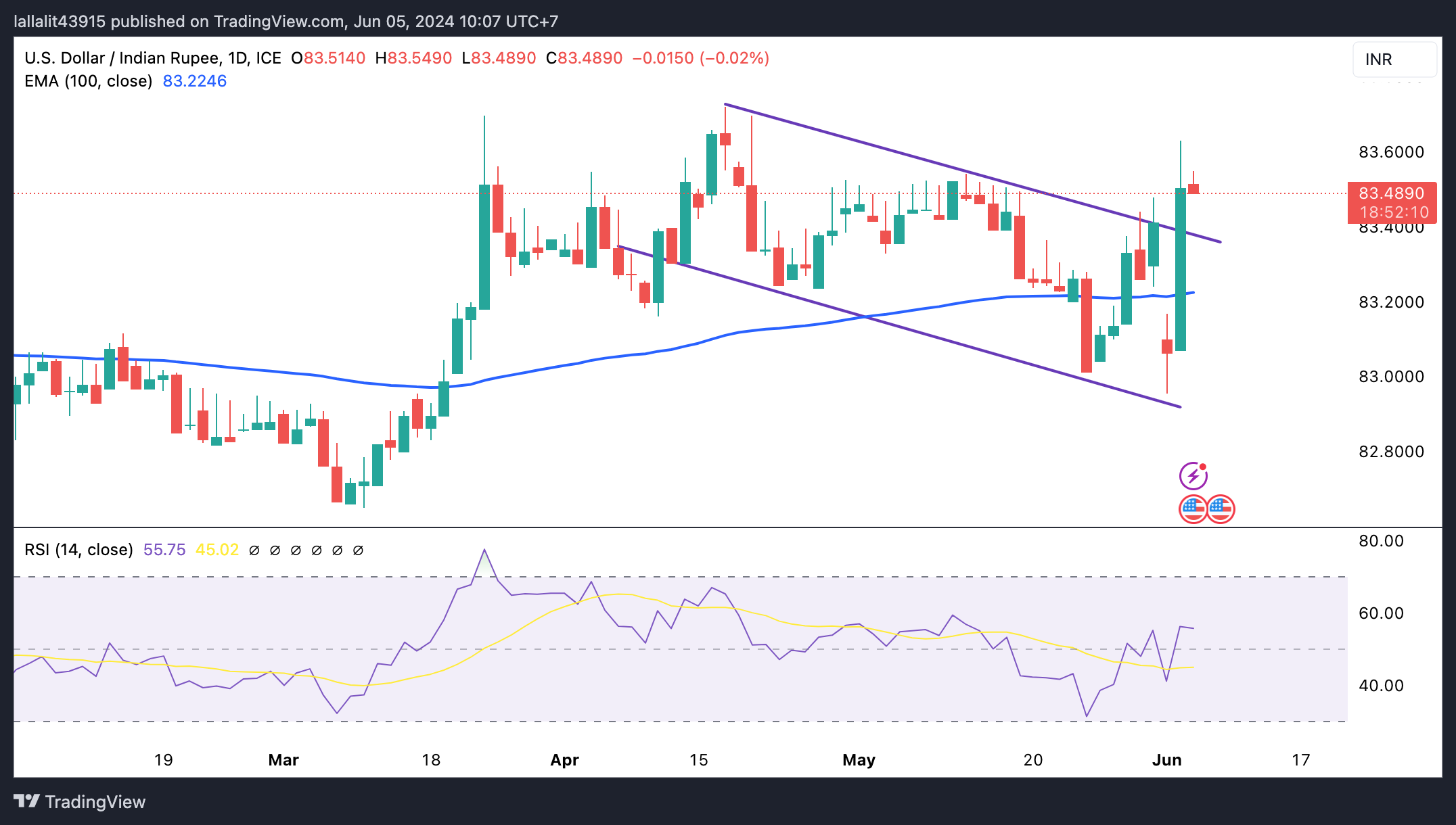 技术分析:每日图表上,美元/印度卢比在下降趋势通道上方爬升