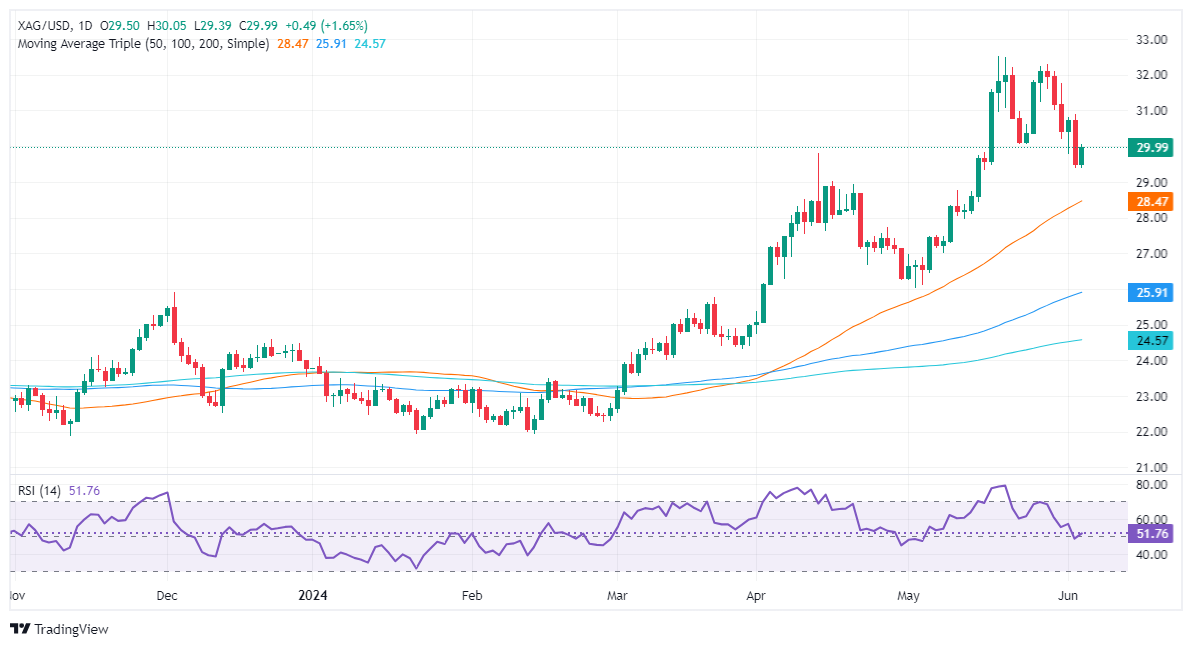 在《白银日报》的图表中,出现了一个双顶级图表模式,为进一步的亏损打开了大门。尽管这款灰色金属攀升至5月24日的低点,将阻力转至30.05美元,但买家仍在努力收回30.00美元,为进一步下跌铺平了道路。