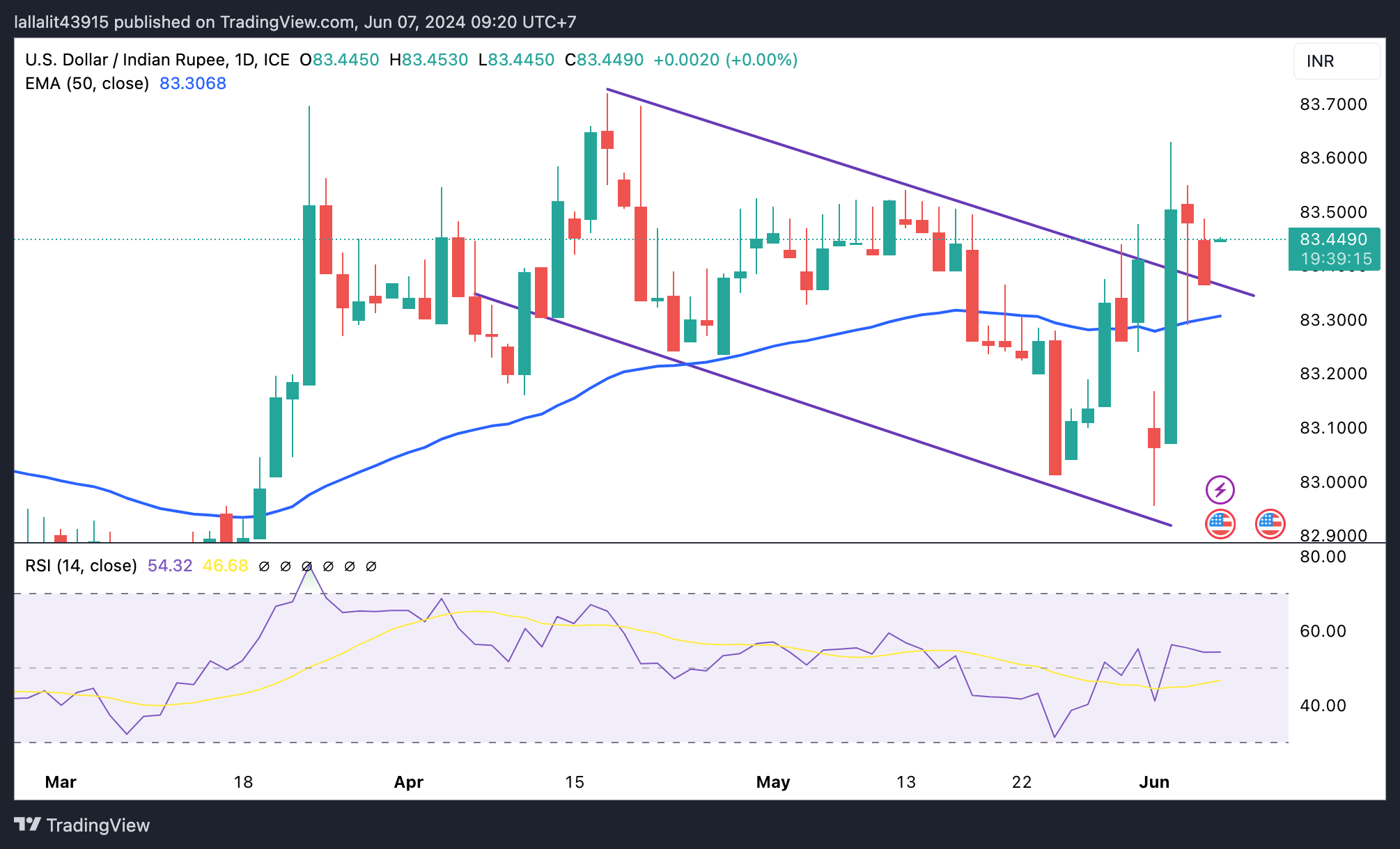在看涨事件中,6月5日n高点对83.55起的作用是美元/印度卢比的直接阻力水平。观察的另一个上位目标是4月17日83.72点,然后是84.00圆点。
