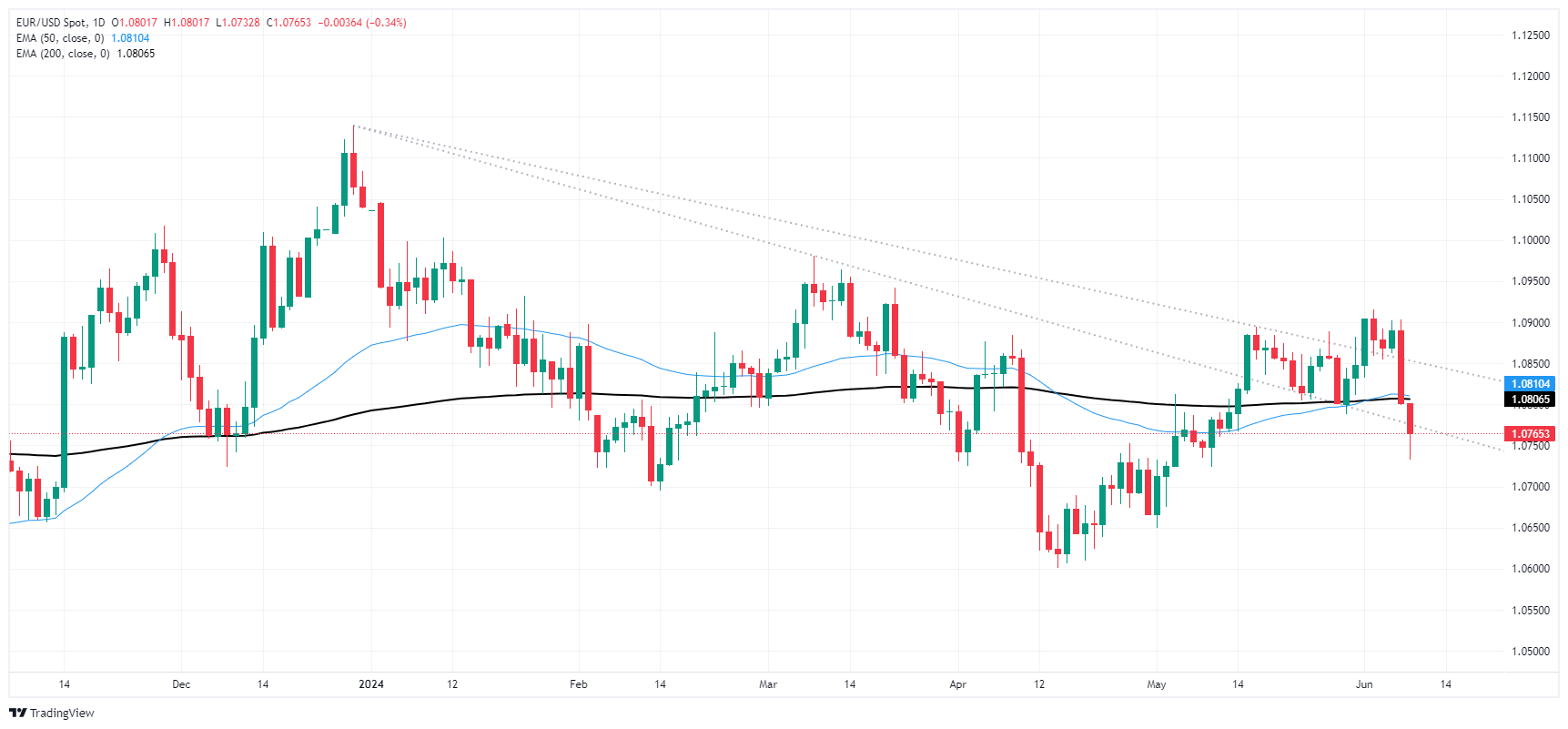 为期两天的倒退已将欧元/美元拉回至1.0806时的200日指数移动平均值(EMA)之下,近期的修正将在2024年接近1.1140的最高出价的下降趋势线上搁浅。
