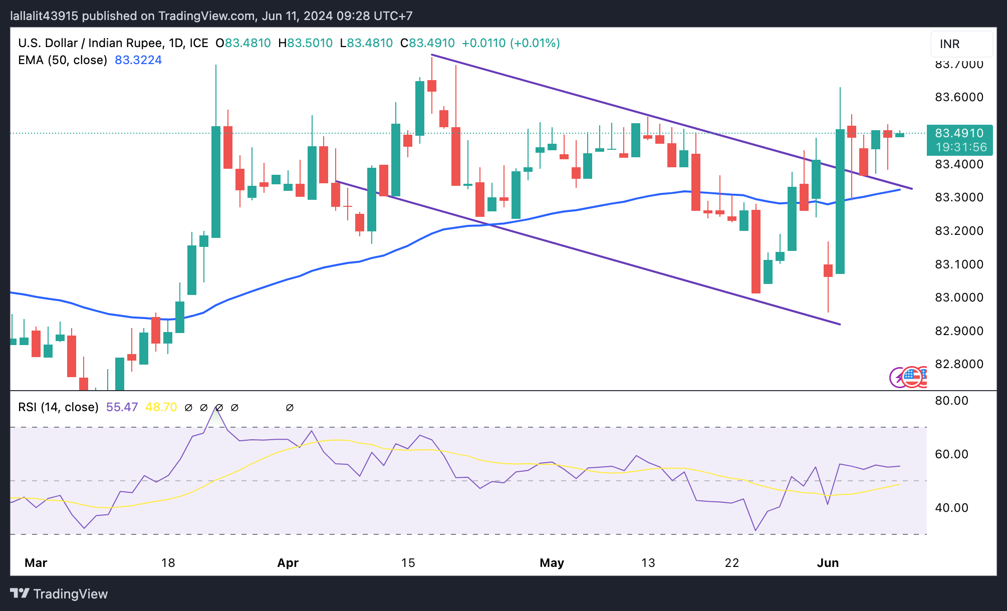 印度卢比在白天交易。美元/印度卢比保持看涨趋势在每日时间表上保持不变,而在下降趋势通道和关键的100日指数移动平均线(EMA)上方保持不变。