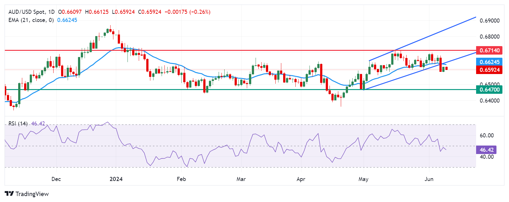 澳元周二的交易额约为0.6590。对每日图表的分析表明,澳元/美元对的看涨偏差正在减弱,因为它已经下降到上升通道模式的下边界以下。14天相对强度指数(RSI)支持这一点,该指数略低于50水平。