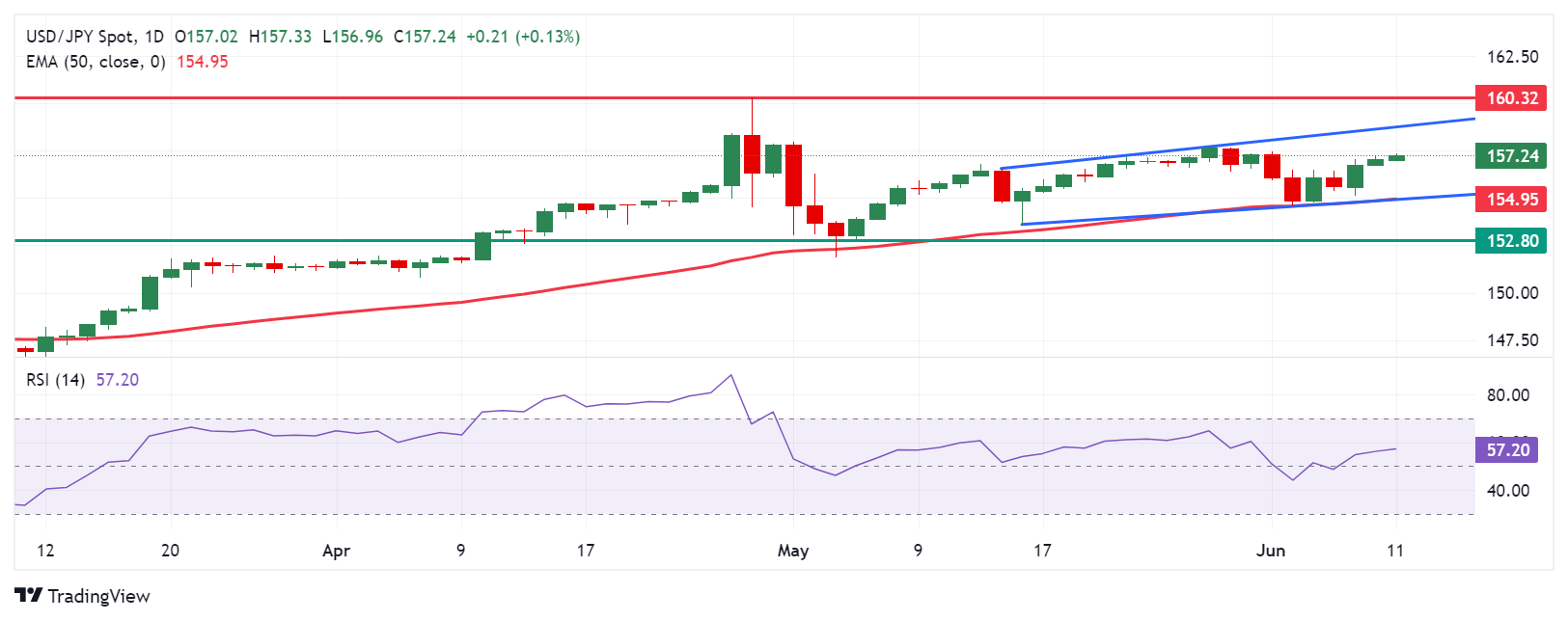 周二,美元/日元约为157.20。每日的分析 图表 在上升的通道模式中,当两对合并时,显示出一个看涨的倾向。此外,14天相对强度指数(RSI)位于50水平以上,表明上升势头的倾向。