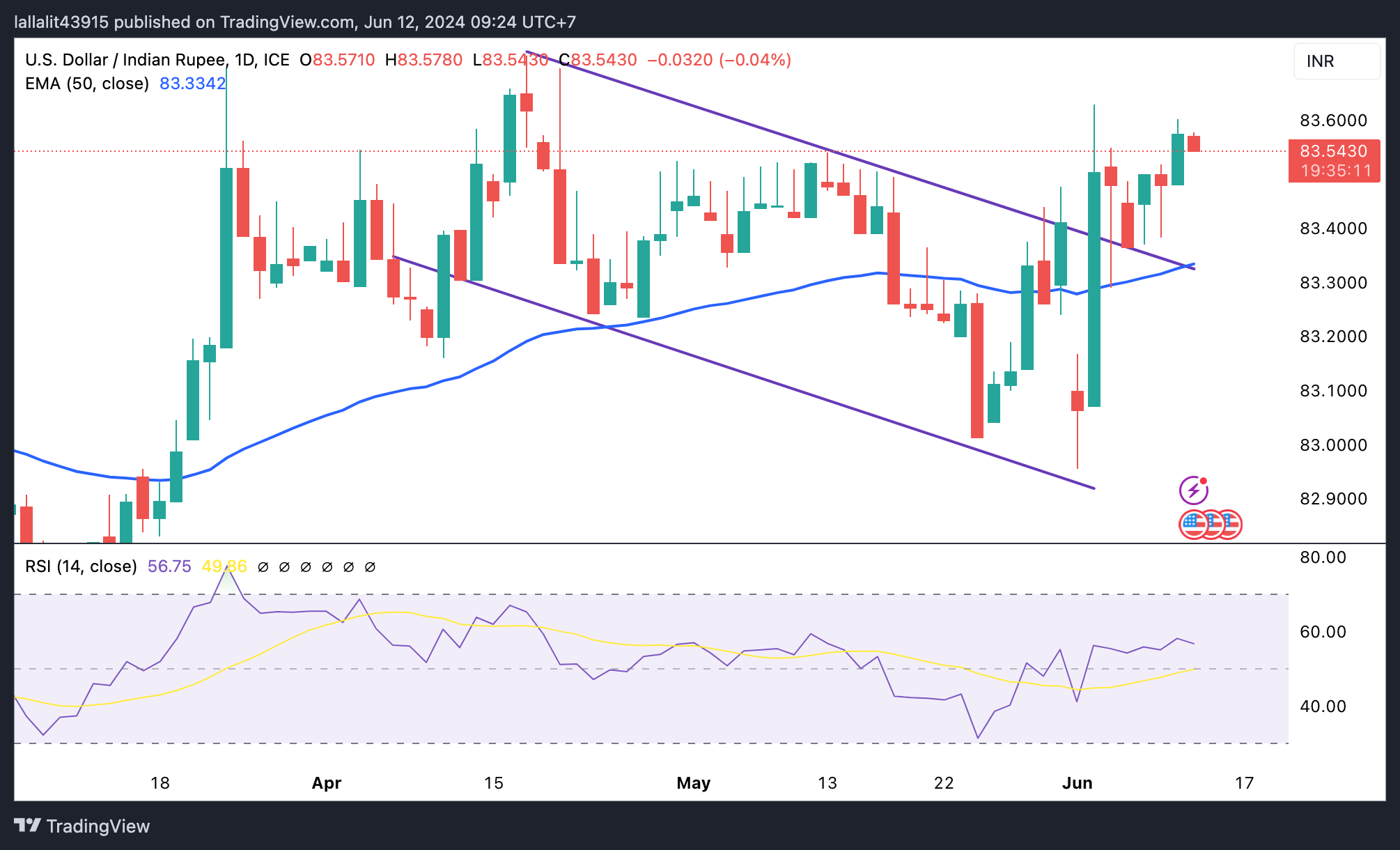 印度卢比白天交易更强劲。美元/INR对的正前景占主导地位,因为这对正前景高于关键的100日指数移动平均值(EMA)和下降趋势通道上界。