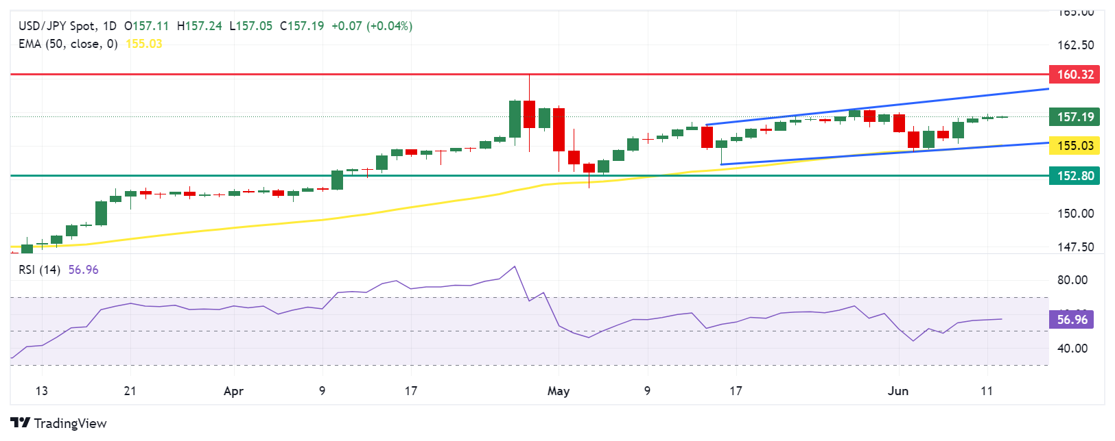 周三,美元/日元约为157.20。每日的分析 图表 在上升通道模式中,当这对组合合并时,表明了一个看涨的倾向。此外,14天相对强度指数(RSI)高于50水平,表明上升势头的趋势。