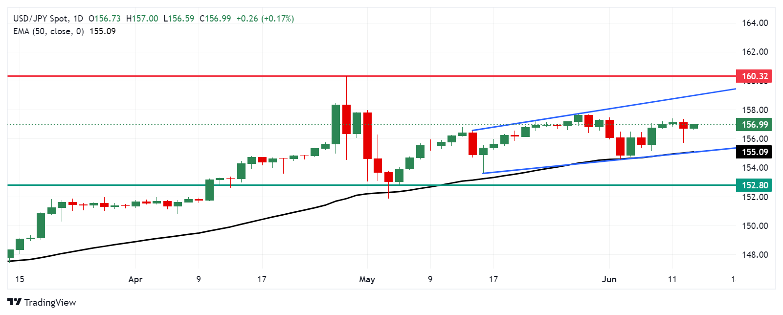 周四,美元/日元约合156.90。每日的分析 图表 表示在上升通道模式中合并时的看涨倾斜。此外,14天相对强度指数(RSI)高于50水平,表明有上升势头的趋势。