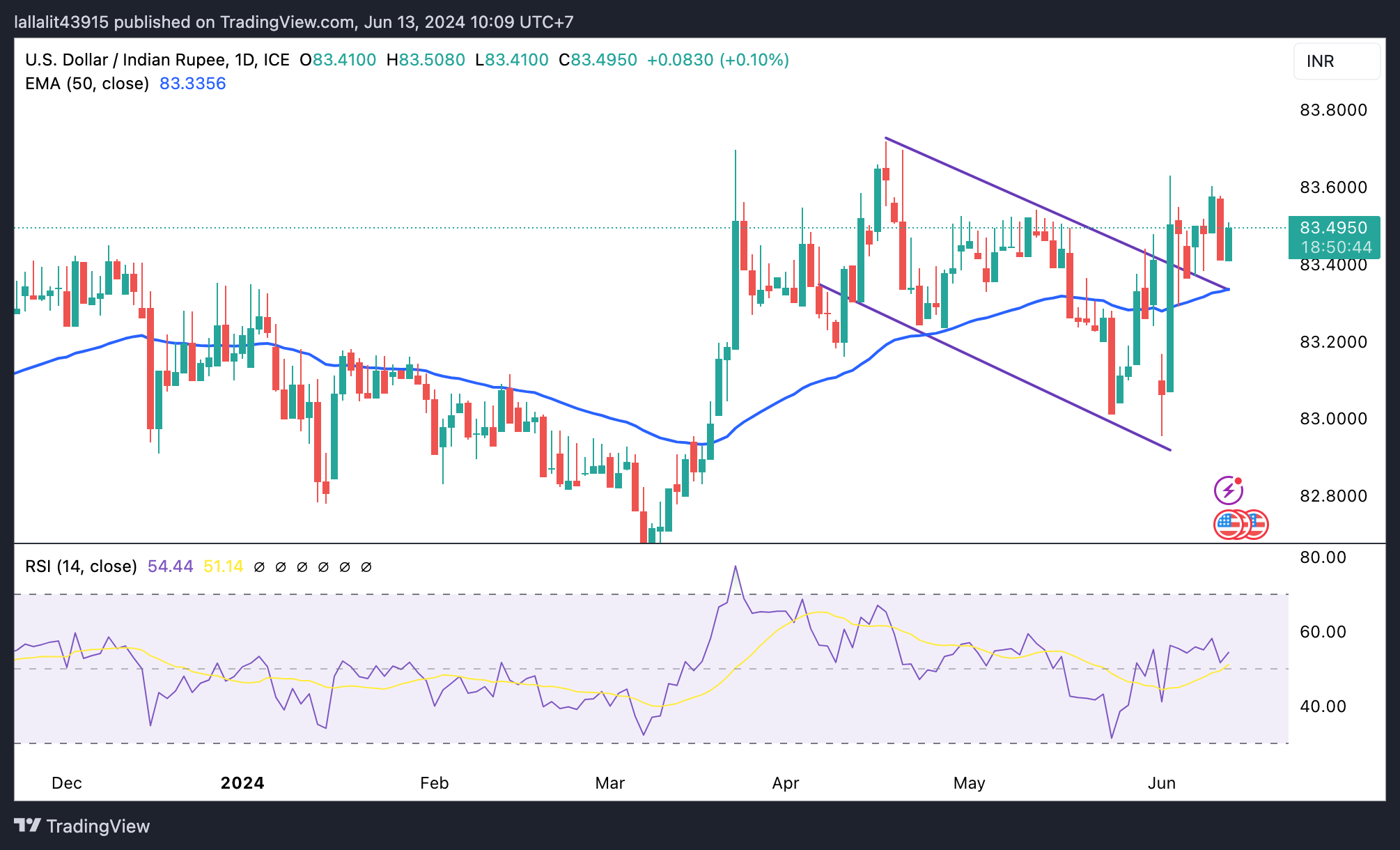 印度卢比当天交易的是负领域。美元/印度卢比对的建设性前景保持不变,因为这对对保持在关键的100日指数移动平均(EMA)之上,并在每日时间范围内下降趋势通道的上界。
