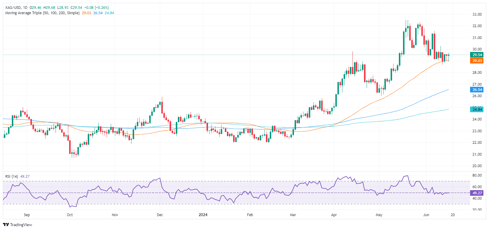 白银连续第二个交易日收于29.50美元以上,涨幅0.30%。梅的美国 零售销售 数据令投资者感到失望,并刺激了人们对美国央行可能削减投资的预期。 费率 今年。这给美国国债收益率和美元带来了压力。