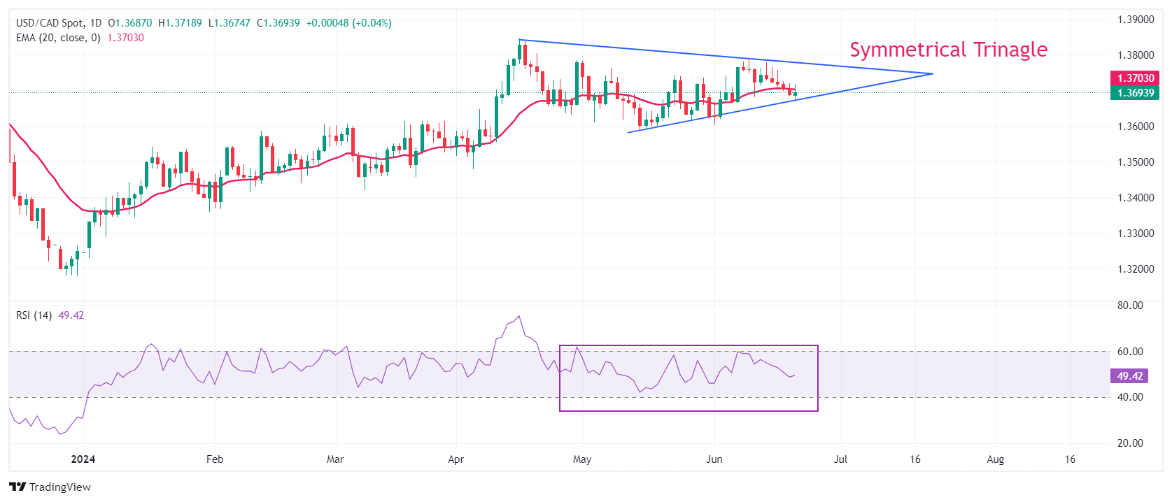 在对称三角形中交易 图表 图案,表明波动性急剧收缩。现货价格对20天指数移动平均值(EMA)接近1.3.7的趋势依然保持粘性,这表明了一个横向趋势。
