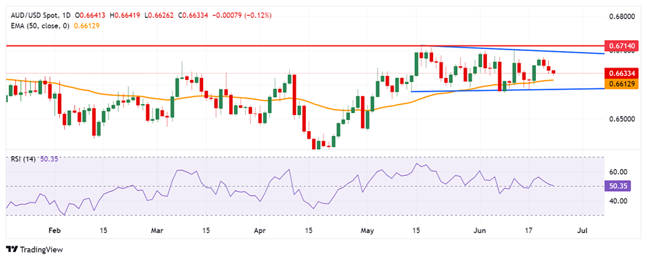 澳元/美元可能在0.6612的50天指数移动平均值(EMA)附近找到支持,额外支持值大约为0.6585,标志着一个矩形组的下边界。