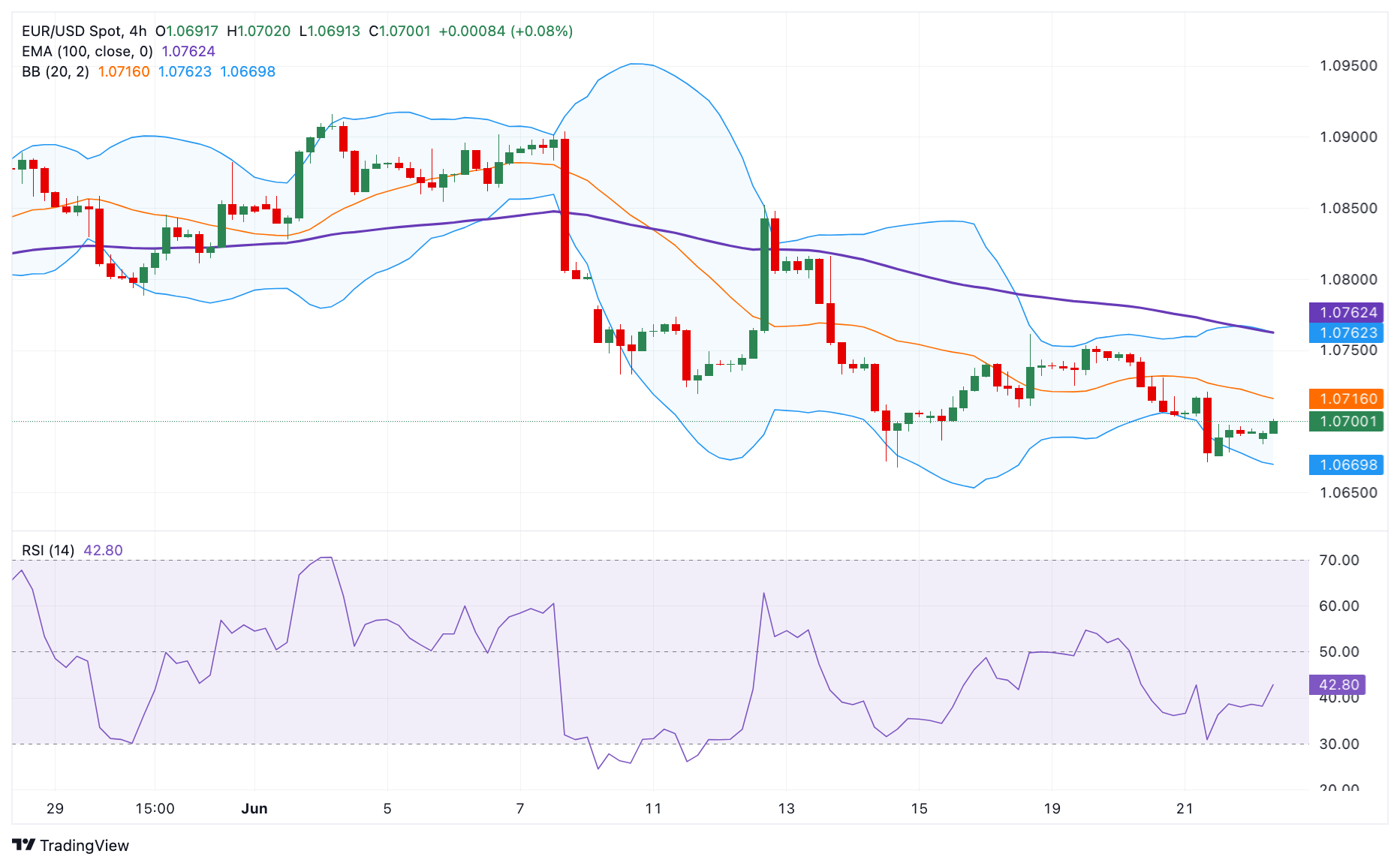 欧元/美元的关键上界屏障将出现在1.0762附近,描绘了100期EMA的汇合和布林格带的上界。再往北,下一道障碍是在6月15日的最高点1.0815处。任何后续购买将看到1.0852,一个6月12日的高点反弹。