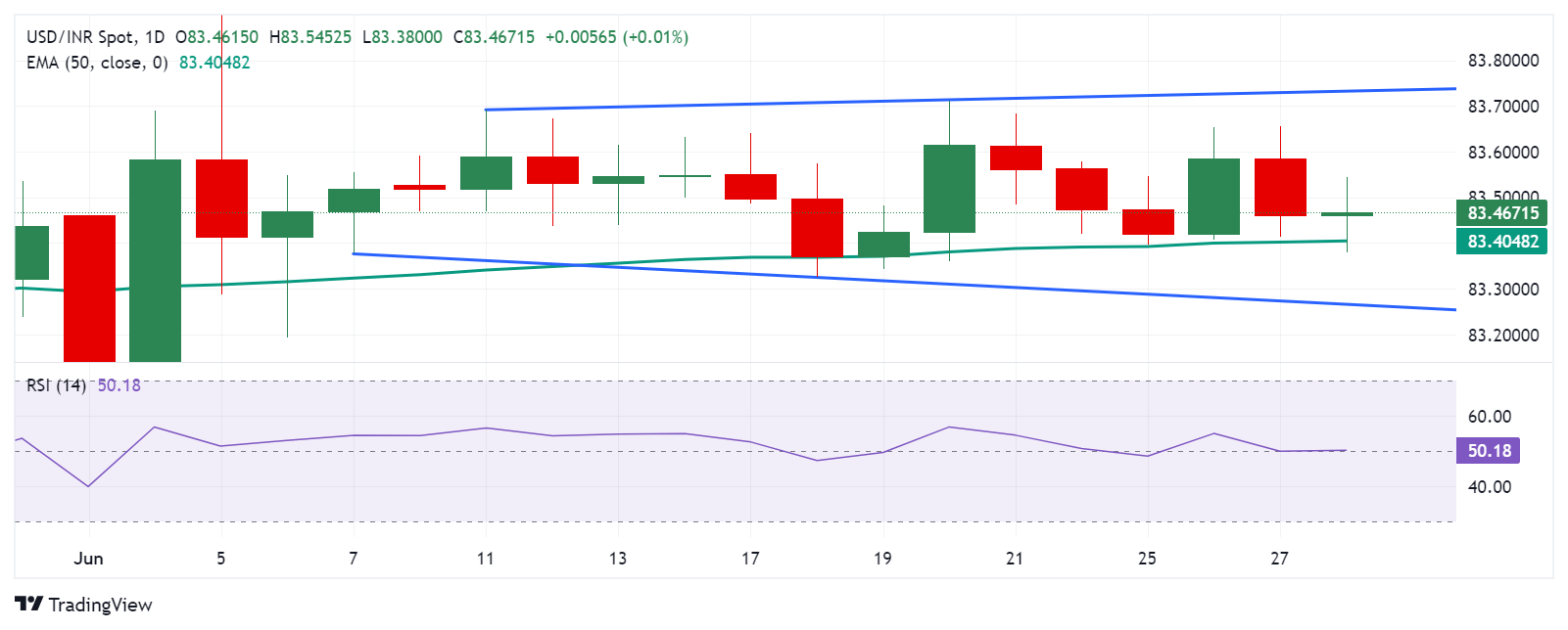 上周五,美元/印度卢比的交易额在83.40左右。… 分析 每日图表显示了一个扩展的模式,表明在向下移动之前可能会进行修正。14天相对强度指数(RSI)低于50水平,表明看跌偏向。美元/INR对测试50天指数移动平均值83.40的直接支持。低于这一水平的中断可能会加强看跌的偏倚,这可能会导致这对人走向扩展模式的较低边界,大约83.30水平。