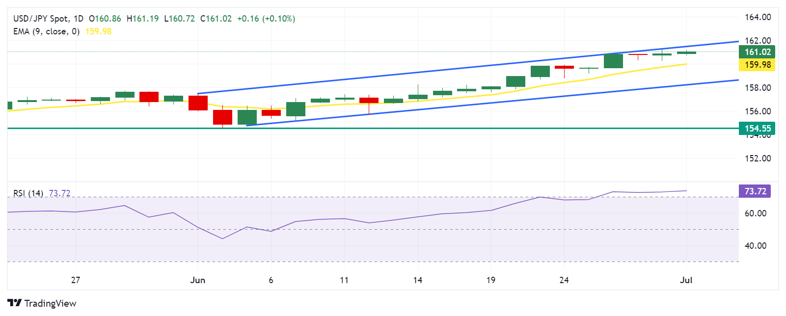 周一美元/日元约为161.00。每日图表显示了一个看涨的偏倚,一对在上升通道图案的上部边界附近盘旋。14天相对强度指数(RSI)位于50水平以上,表明上升势头。
