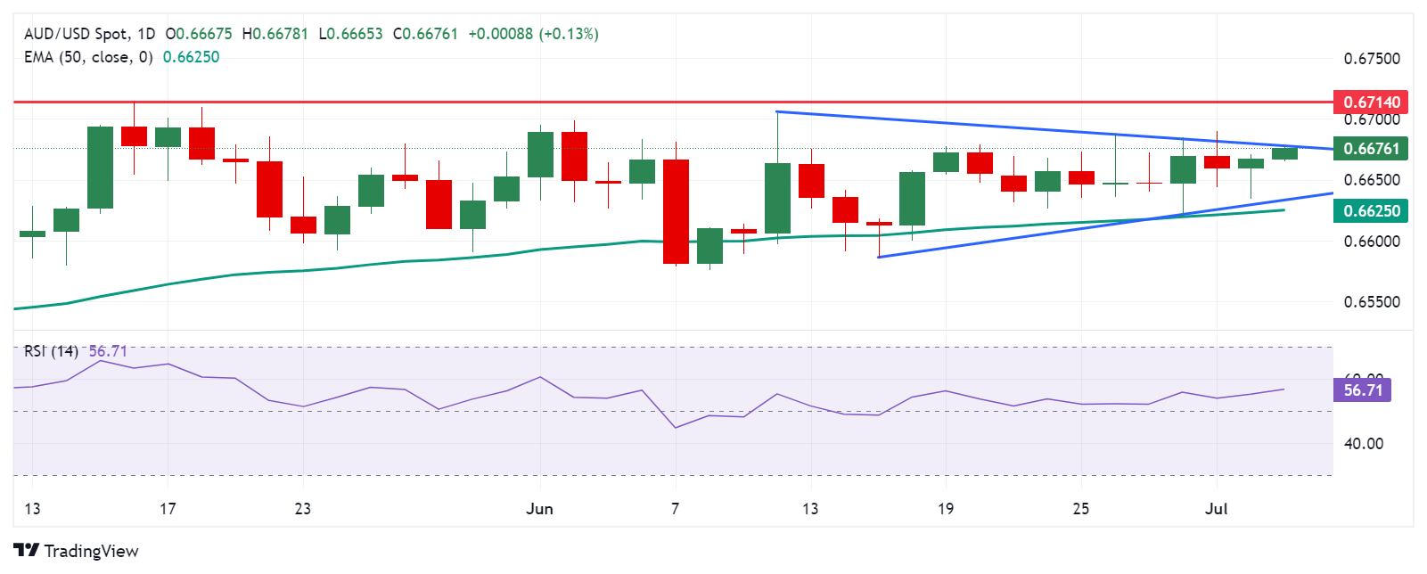 澳大利亚元周三的交易额约为0.6670。每日图表的分析显示了一个对称的三角形,这代表了当交易者达到平衡时趋势的停顿。然而,一旦价格决定性地从三角形突破,它将标志着一个明确的方向趋势。然而,14天相对强度指数(RSI)略高于50水平,表明看涨偏向。