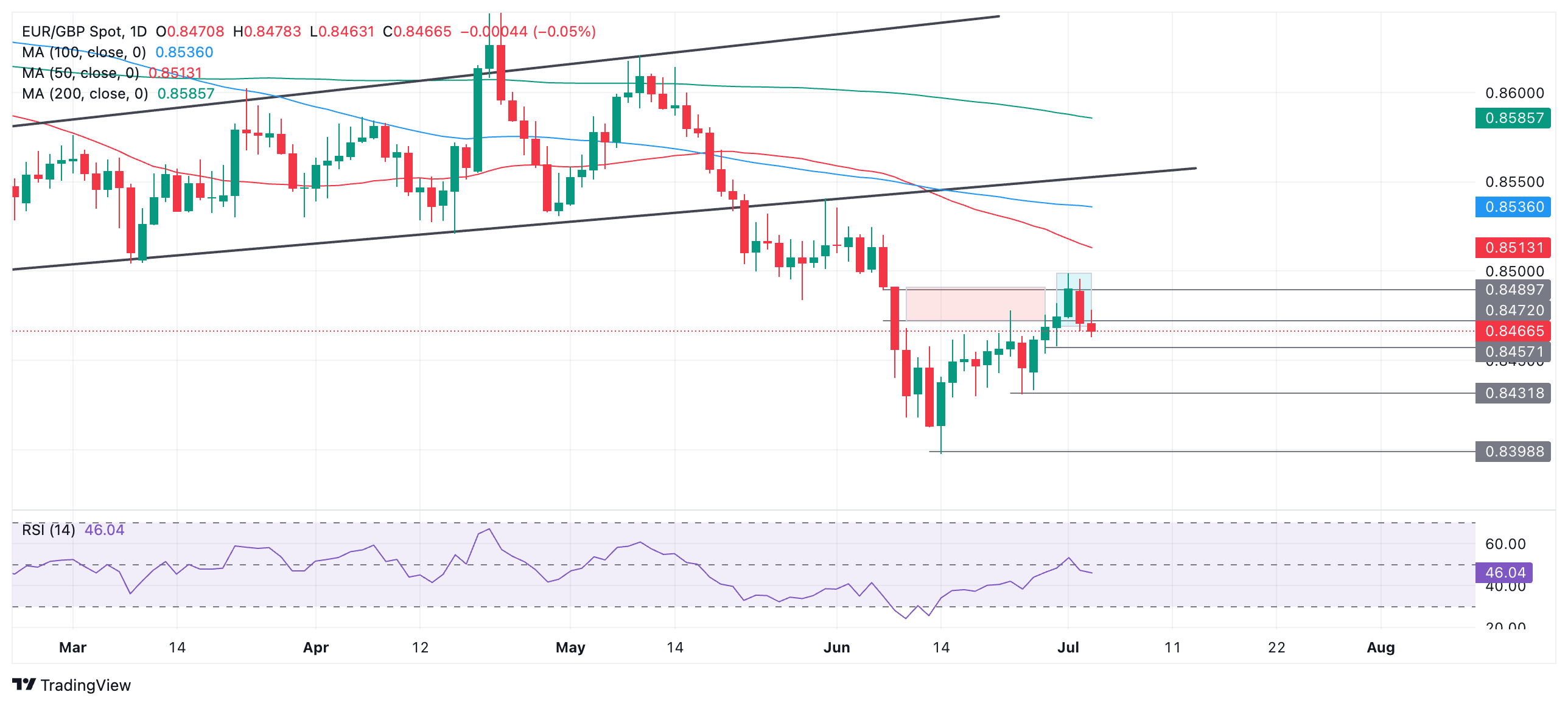 欧元/英镑在填补了6月10日大幅下跌期间0.8472至0.8490(红色阴影区)之间的价格缺口后,已经下跌。