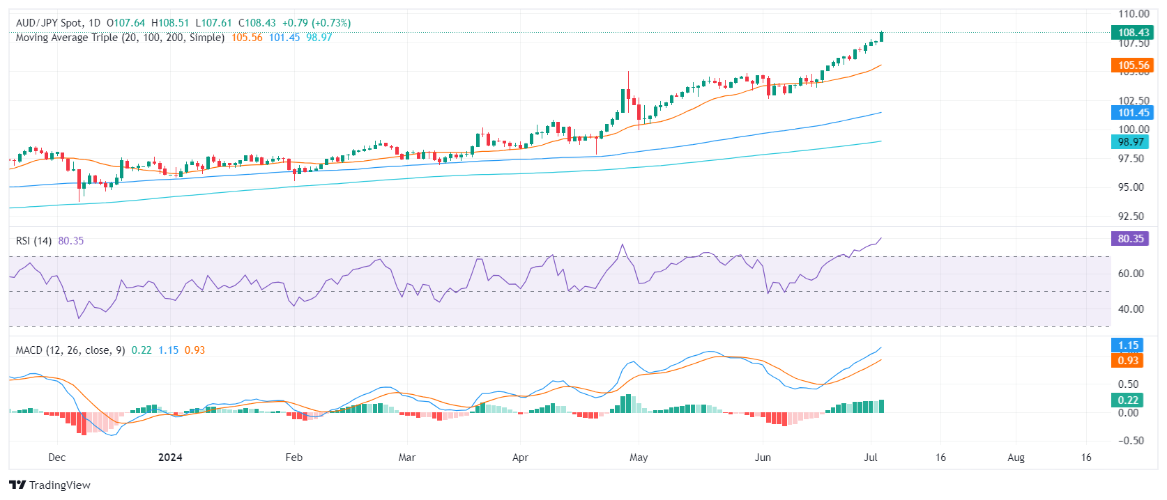 澳元/日元价格分析:澳元/日元延长了其上升轨迹,达到了108.40点